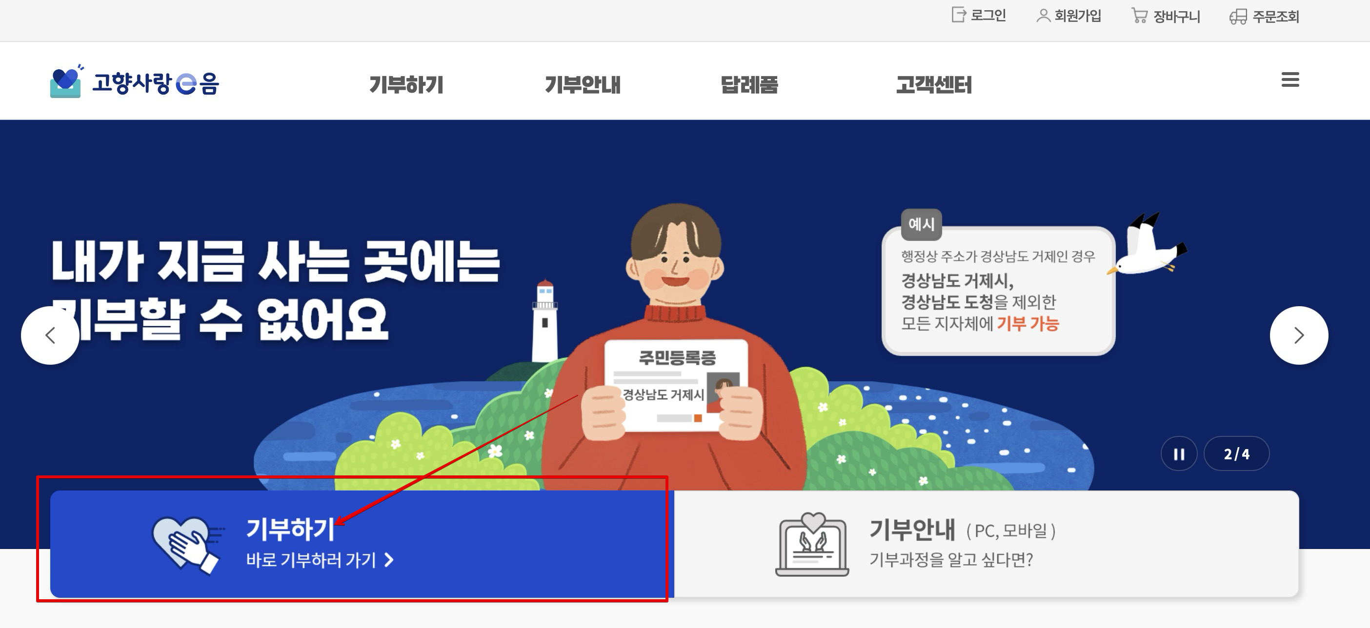 홈페이지가 나오면 로그인 해주시고요. 다음으로 첫 화면에 있는 [기부하기]버튼을 클릭합니다.