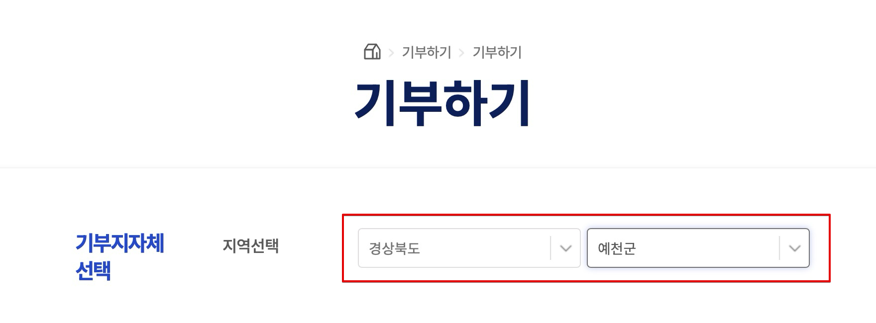 기부하기 창이 나오고 기부 지자체를 선택할 수 있게 되면, 여기에서 [경상북도][예천군]을 선택합니다.