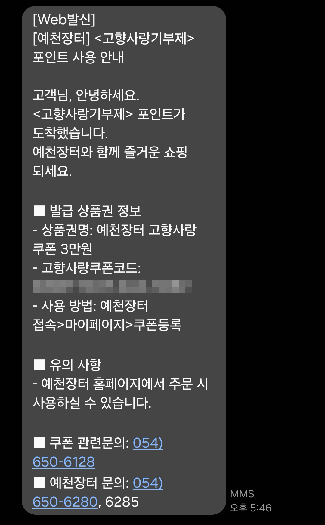 몇 시간 정도 기다리다보면 예천장터 고향사랑기부제 쿠폰코드 문자가 옵니다. 이 쿠폰코드를 이용해서 예천장터 홈페이지에 등록해주면 3만 포인트를 가져올 수 있습니다.