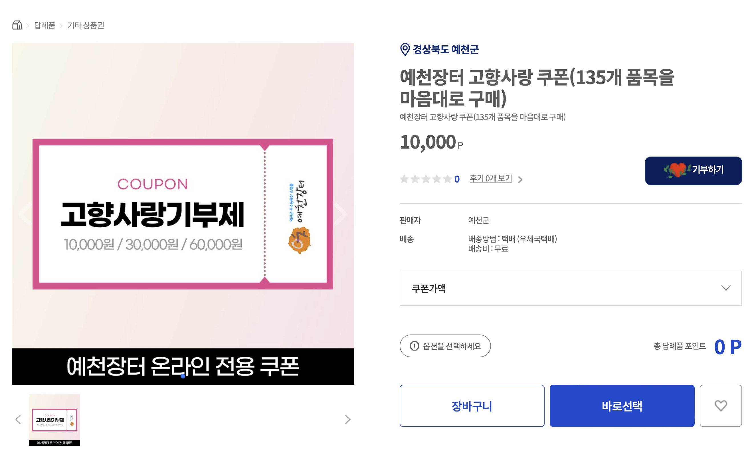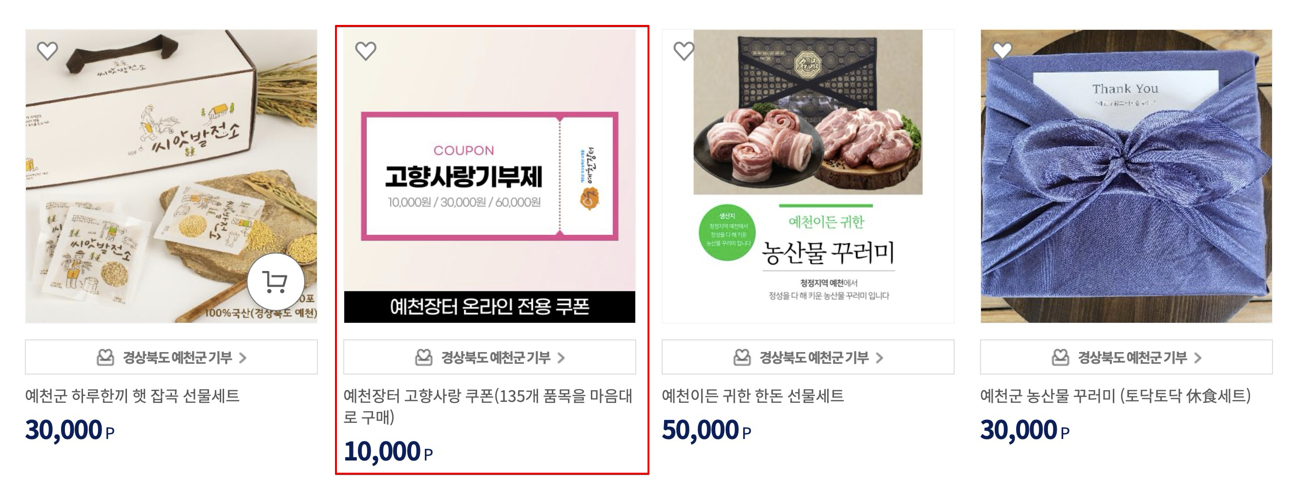 고향사랑기부제 홈페이지에서 예천장터 온라인 전용 쿠폰 10,000원짜리를 3개 구매해줍니다.
