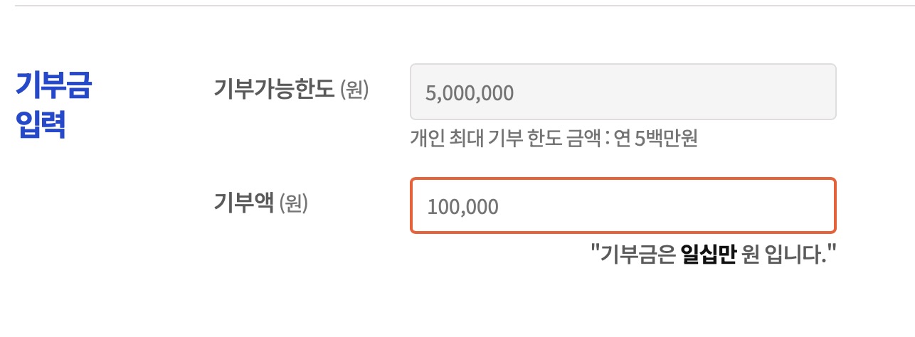 다음으로 기부금액을 입력합니다. 저는 10만원을 우선 기부하도록 하겠습니다. 기부액에 10만원을 넣어주고요.