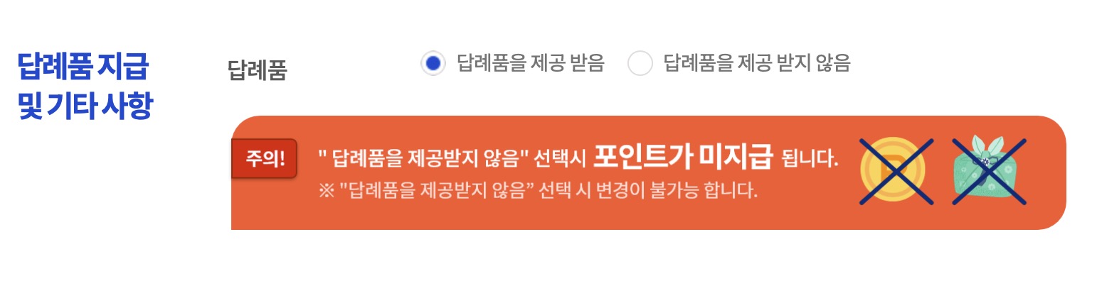 여기가 중요한 포인트인데 답례품을 받아야하는데 [답례품을 제공 받음]을 선택할 수 있고 [답례품을 제공 받지 않음]으로 선택할 수 있습니다. 답례품을 제공받지 않음으로 하게 되면 실제로 답례품을 제공받을 수 없어지므로 여기에서 꼭! [답례품을 제공 받음]으로 선택하셔야합니다.