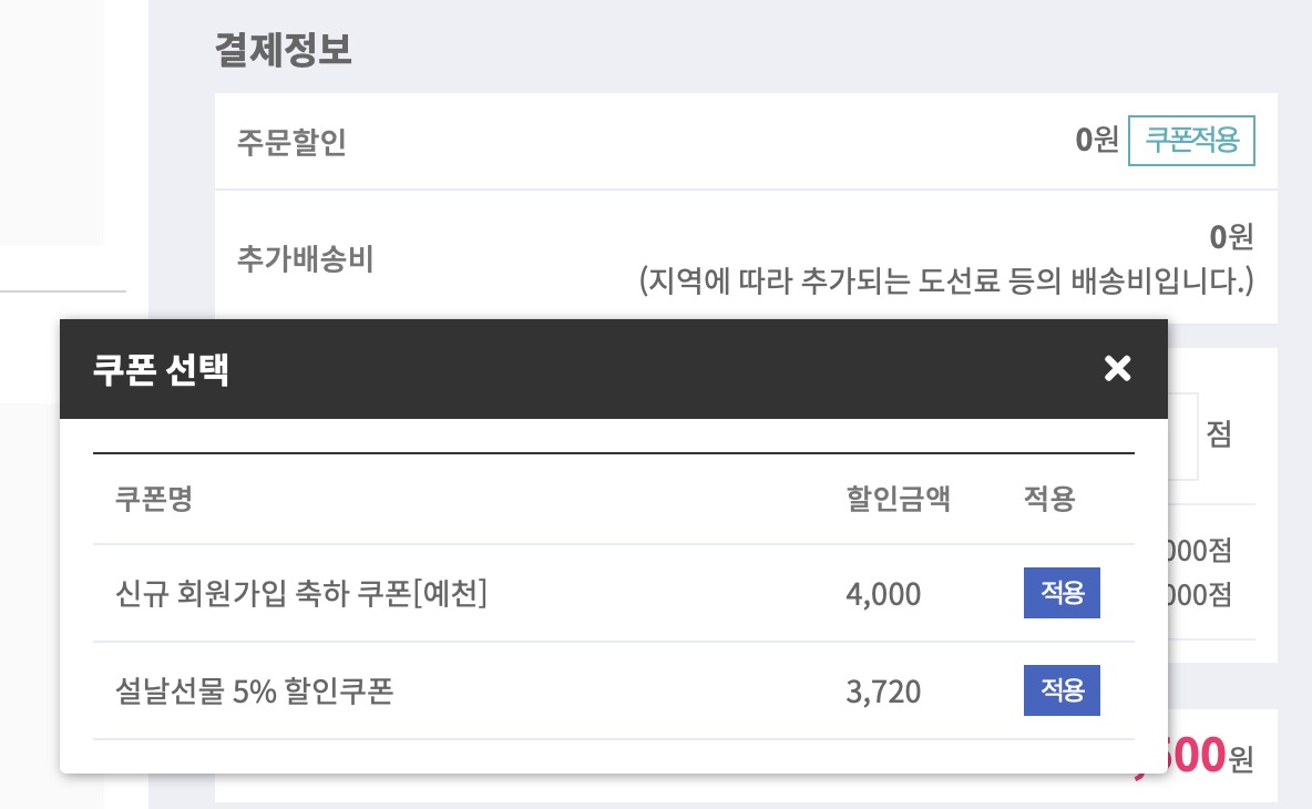 주문 결제 창에서는 쿠폰을 선택해줍니다.