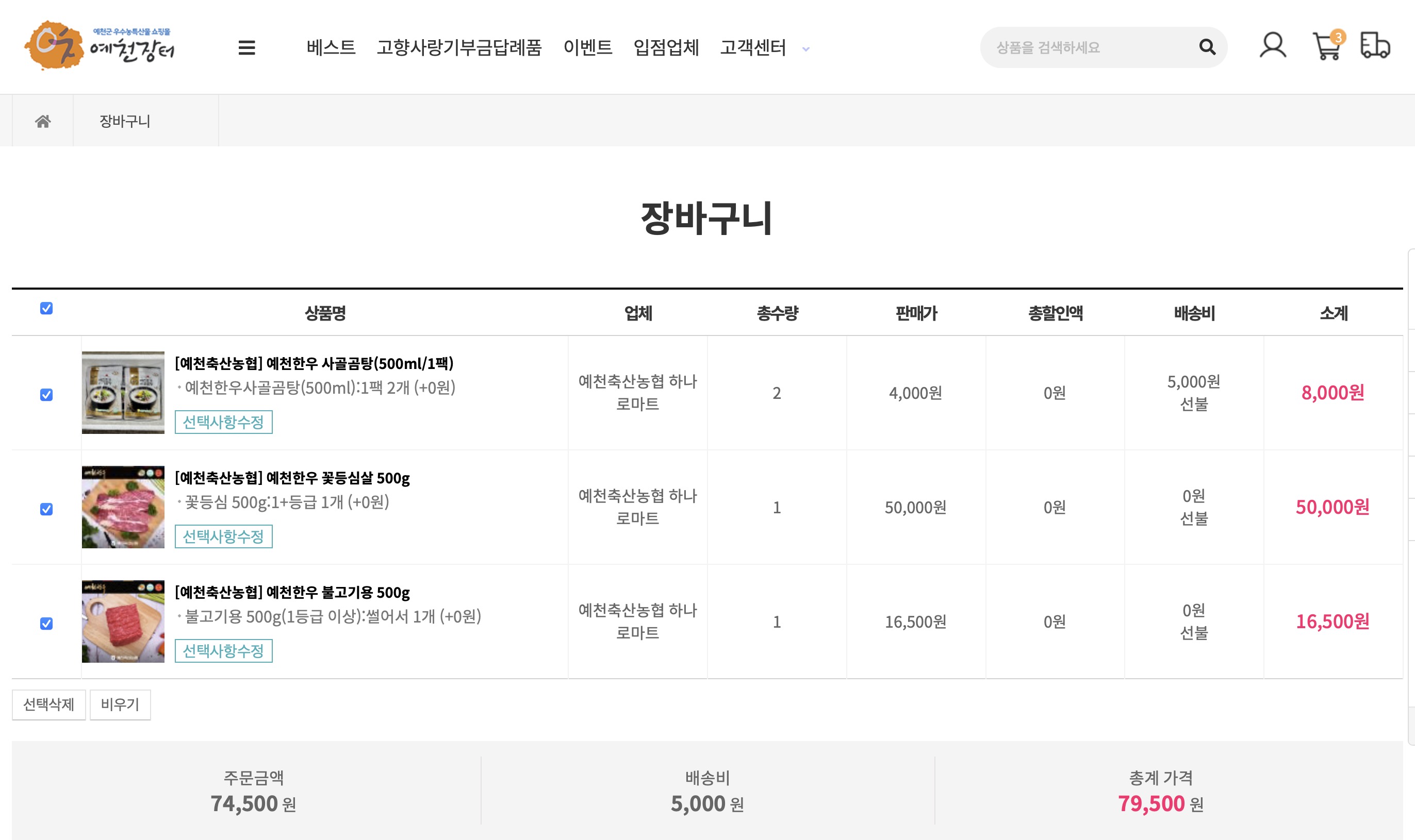 예천장터에 입점한 상품들 중에서 예천축산농협 하나로마트라는 곳에서 예천한우 제품들을 이것저것 구매해보았어요. 불고기용과 꽃등심, 사골곰탕 등 골랐습니다. 여기는 한 근 단위로 판매는 안하는 것 같고 500g 단위로 판매하고 있습니다.
