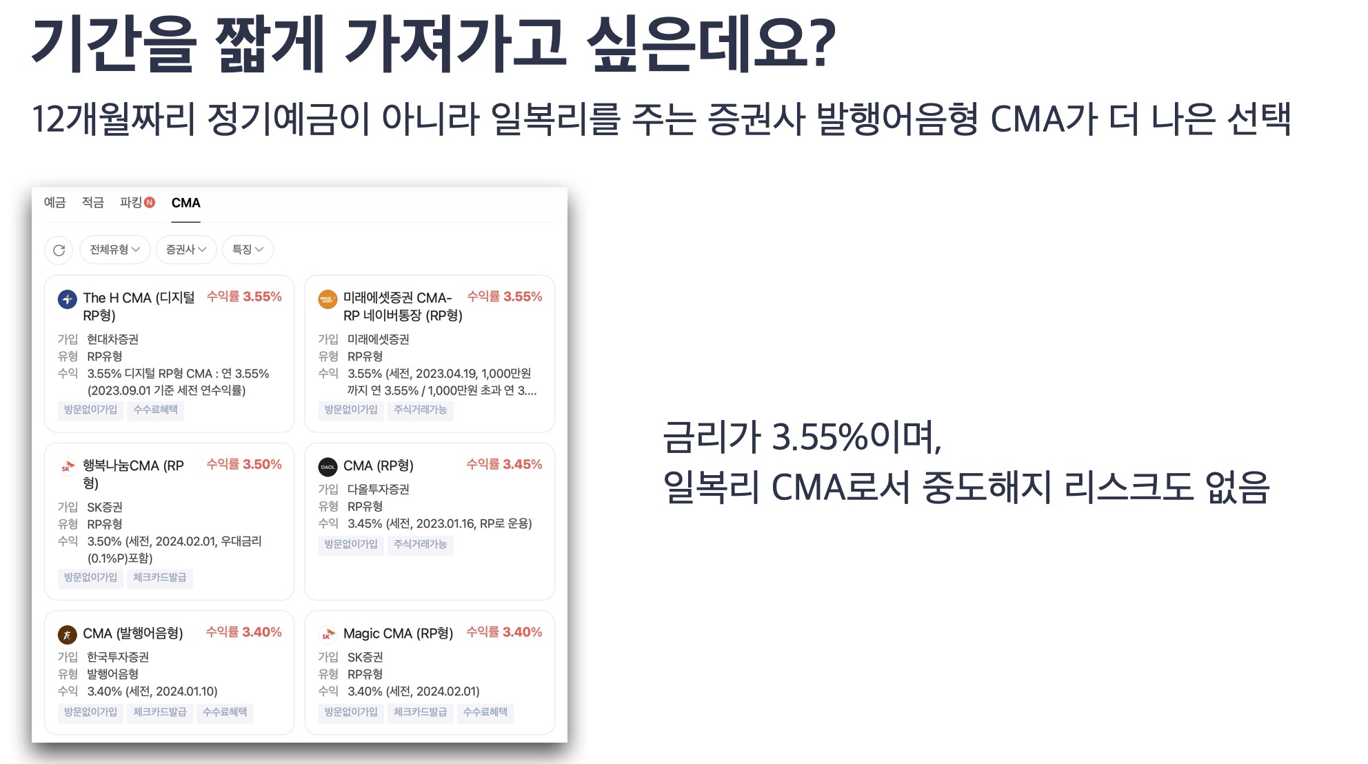 그렇다면 만약 기간이 짧게, 예를들어 3개월만 정기예금 하고 싶다면 어떻게 하면 될까요? 3.5% 이상되는 증권사 발행어음 CMA를 선택하면 됩니다. 예를들어 현재 기준으로 미래에셋증권의 CMA-RP형의 경우 3.55%를 제공합니다.(1000만원 미만)
