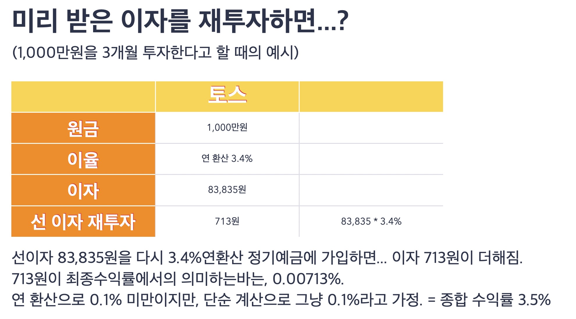토스에서도 강력하게 주장하는 두 가지 특장점이 있는데, 첫번째는 정기예금의 이자를 먼저 주기 때문에 그 이자를 다시 재투자 할 수 있다는 것이고요. 두번째는 이렇게 받은 선이자를 재투자 하지 않더라도 생활비로 먼저 쓸 수 있어서 이득이라는 내용이에요. 그런데 정말일까요?