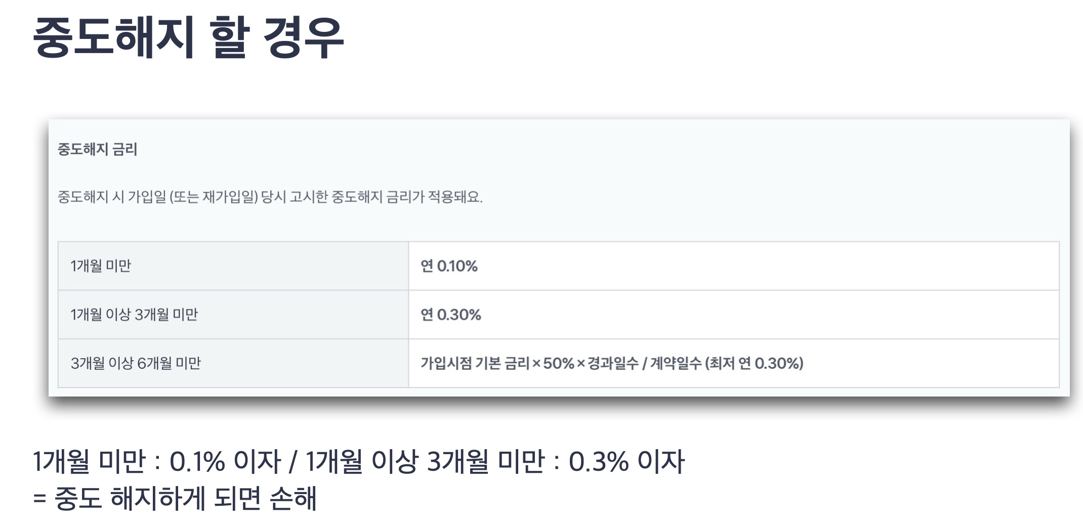 중도해지할 경우, 0.1%~0.3%의 금리만을 제공해주기 때문에 중도에 해지하게 되면 손해가 큽니다. 사실 이건 토스 선이자 정기예금 뿐만 아니라 일반 정기예금도 비슷하지만 어쨌거나 중도에 해지하게 되면 선이자든 뭐든 이자를 못받고 기회비용을 상실하게 됩니다.