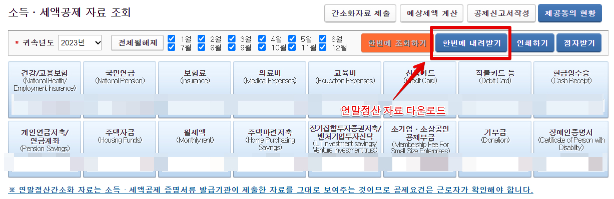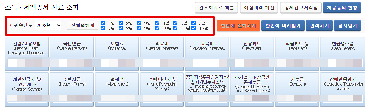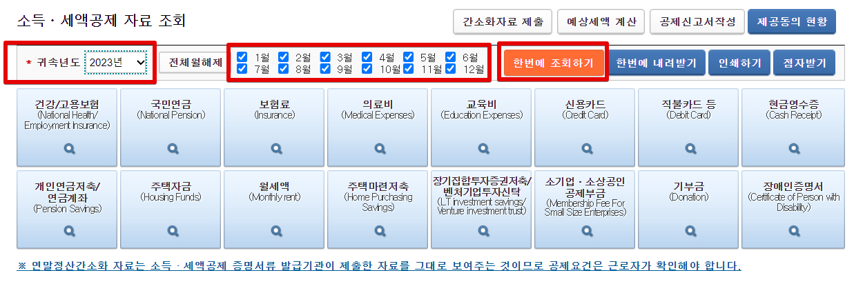 소득 세액공제 자료 조회 화면이 나타납니다. 여기에서 귀속년도가 2023년이 맞는지(2024년 2월 기준), 그리고 모든 월에 체크가 되어있는지를 확인한 후 [한번에 조회하기]를 클릭합니다. 이 한번에 조회하는 기능은 원래는 없었던 기능이었어서 지금까지는 저기 돋보기를 모두 하나씩 클릭해줘야하는 번거로움이 있었는데 이번에 한번에 조회하기 기능으로 하나씩 클릭하지 않아도 모두 조회할 수 있게 바뀌었습니다.
