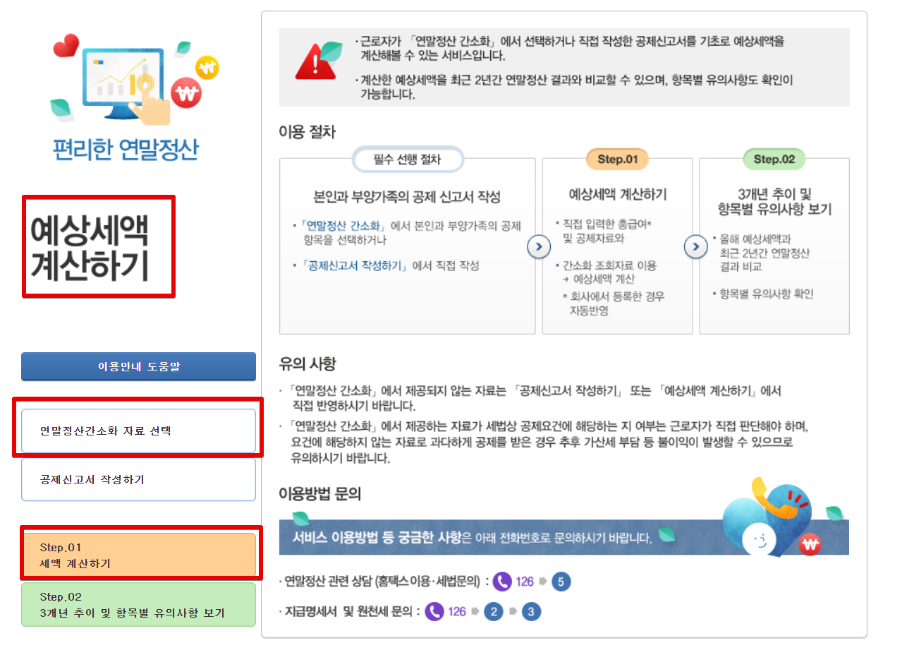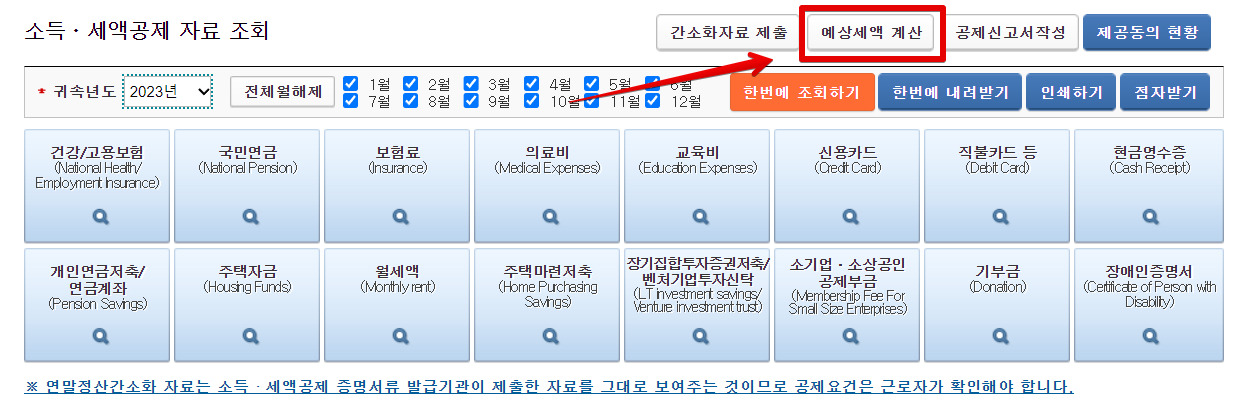 일단 연말정산을 위해서 제일 먼저 국세청 홈택스에서 총급여액을 계산해야합니다. 미리 국세청에 신고가 되어있다면 조회를 통해 할 수 있고요. 만약 아직 신고전이라면, 직접 계산을 해서 총급여액을 입력해야 예상세액을 확인할 수 있으므로 이 부분이 상당히 중요합니다.