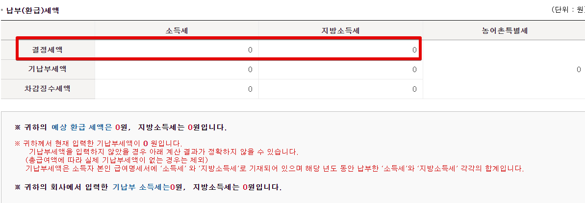 이후 예상세액을 계산해보면, 결정세액이 0원으로 계산되면 됩니다.