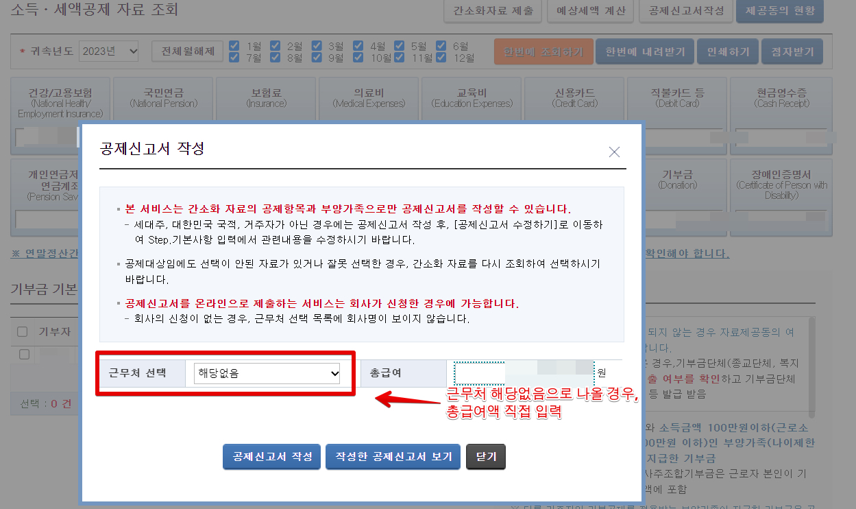 공제신고서 작성 화면이 나타납니다.(위쪽 버튼 중에 [공제신고서 작성]버튼 있습니다) 여기에서 근무처를 선택해주면 홈택스에서 바로 간소화자료 제출까지도 가능합니다. 그런데 회사에서 국세청에 등록하지 않았을 경우 근무처가 [해당없음]으로 나올 수 있습니다. 이때에는 홈택스에서 직접 간소화자료 제출은 못하며 다운로드 한 PDF 파일을 회사에 제출해서 회사에서 신고를 대신하거나 세무사무실에서 신고를 하도록 합니다.