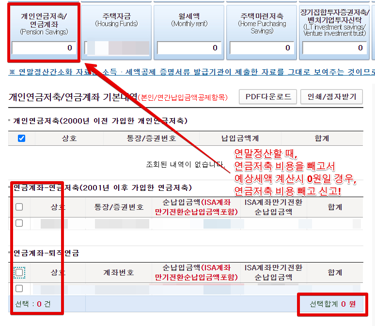 이쯤에서 굉장이 중요한 포인트가 있습니다. 연금저축펀드나 퇴직연금IRP를 가입해서 운용하시는분들 중에서는 세액공제를 목적으로 하는분들과 투자목적으로 운용하시는분들이 계실텐데요. 연말정산을 할 때 연금저축비용을 제외하고서 예상세액이 0원일 경우에는 해당 금액을 빼고 연말정산을 진행하셔야합니다. 그렇지 않을 경우, 연금저축펀드와 IRP에서 세액공제 받은것도 없는데도 세액공제가 적용이 되어버리면서 추후 세금혜택에서 불리해지게 됩니다.