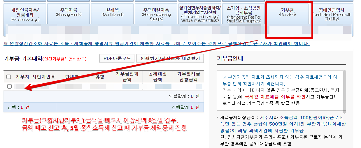 기부금 항목도 똑같습니다. 저같은 경우 세액공제를 위해서 매년 고향사랑기부제를 통해 10만원을 기부하고 있는데요. 이 기부금 내역도 제외하고 연말정산을 했을 때 결정세액이 0원이 나온다면 빼고 신고합니다. 추후 5월 종합소득세 신고 때 기부금을 넣어서 세액공제를 받으면 됩니다.