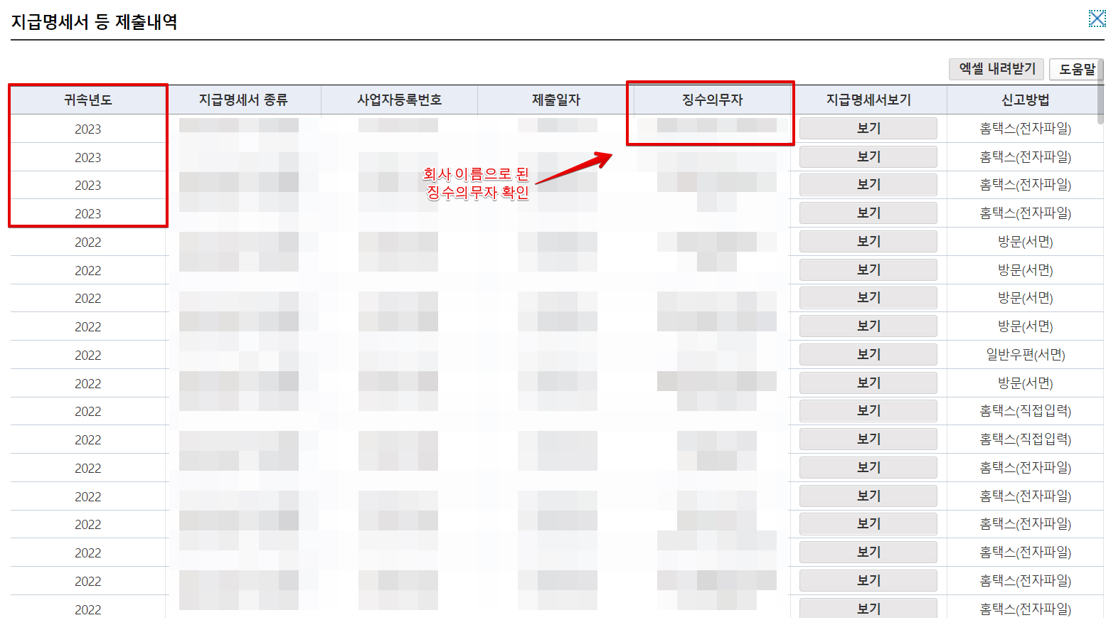여기 자료에는 지금까지의 지급명세서 등 제출내역이 주르륵 나오는데요. 여기에서 [징수의무자] 항목에 자신이 근무하고 있는 회사 이름으로 신고된 지급명세 제출내역을 확인하면 됩니다.