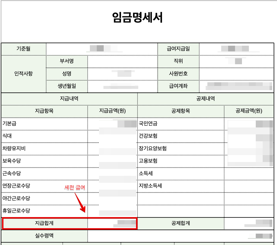 총급여액 계산은 (세전)으로 계산해야 자료가 일치하게 되겠습니다. 따라서 실수령 금액으로 총급여를 계산하면 안되고, 임금명세서에 적혀있는 세전 금액으로 보시면 되는데, 예를들어서