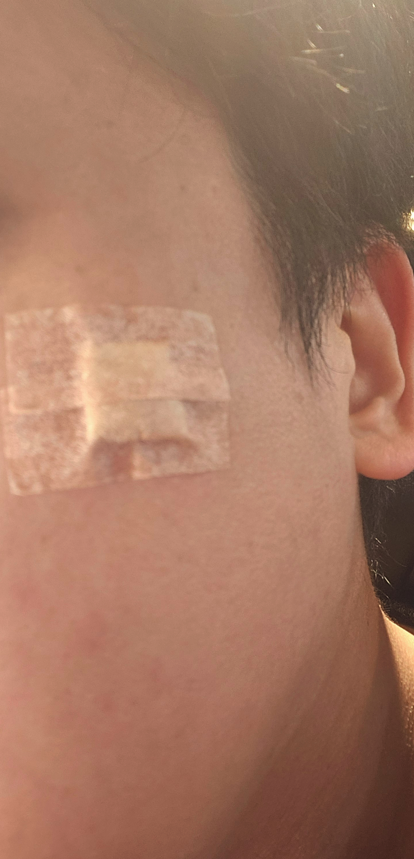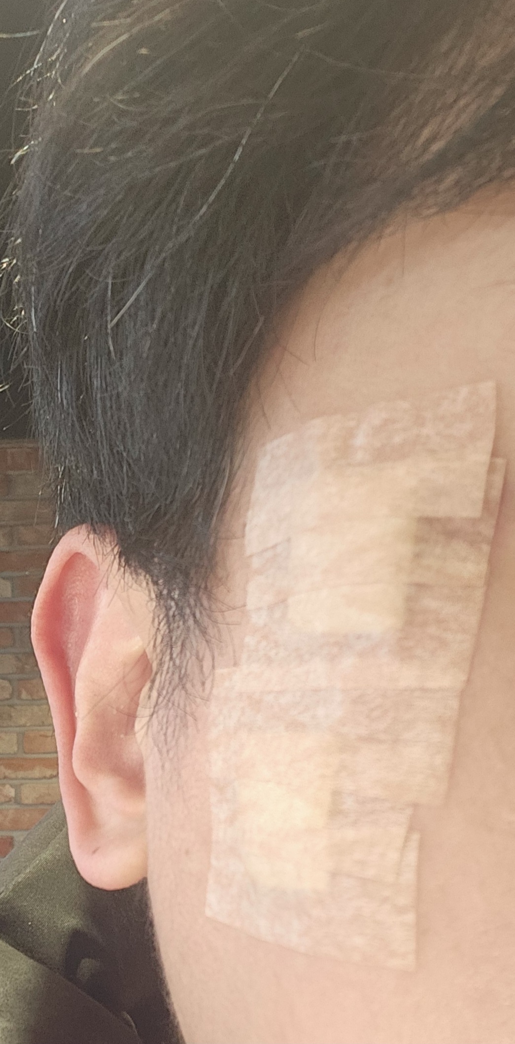 레이저 치료가 끝나게 되면 이렇게 테이프 같은걸 붙여주는데, 이걸 3일동안 붙이고 있어야한다고 해서 그렇게 했습니다. 3일동안 원래 세수도 못하고... 머리 감는것도 거의 못하는 정도였는데, 저는 세수는 못한다고 치더라도 머리 못감는건 너무 답답해서 최대한 얼굴에 물 안묻게 해서 머리는 감았었습니다. ㅋㅋㅋ 욕조 앞에서 거의 몸을 90도로 숙이고 대충이라도 머리 감았었던 것 같아요.
