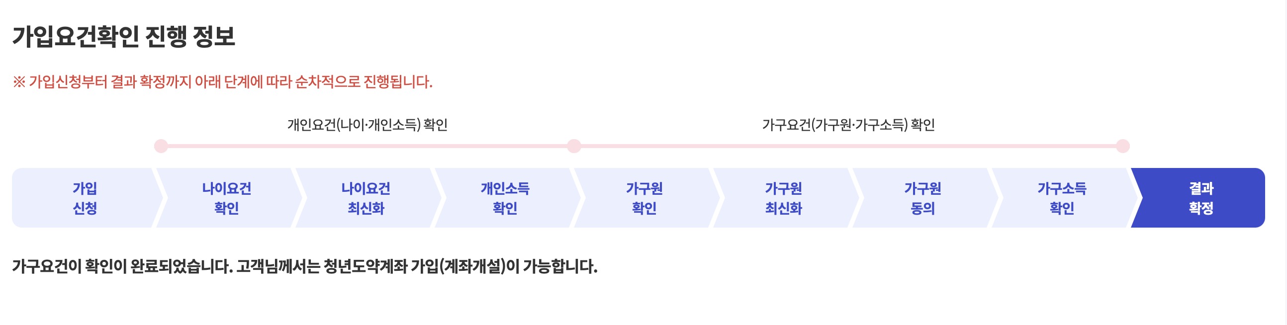 여기에서 조회를 해보면, 가입요건확인 진행 정보를 볼 수 있는데 여기에서 '결과 확정'이 되어있고 아래쪽에 '청년도약계좌 가입(계좌개설)이 가능합니다'라는 문구가 나와있어야합니다.