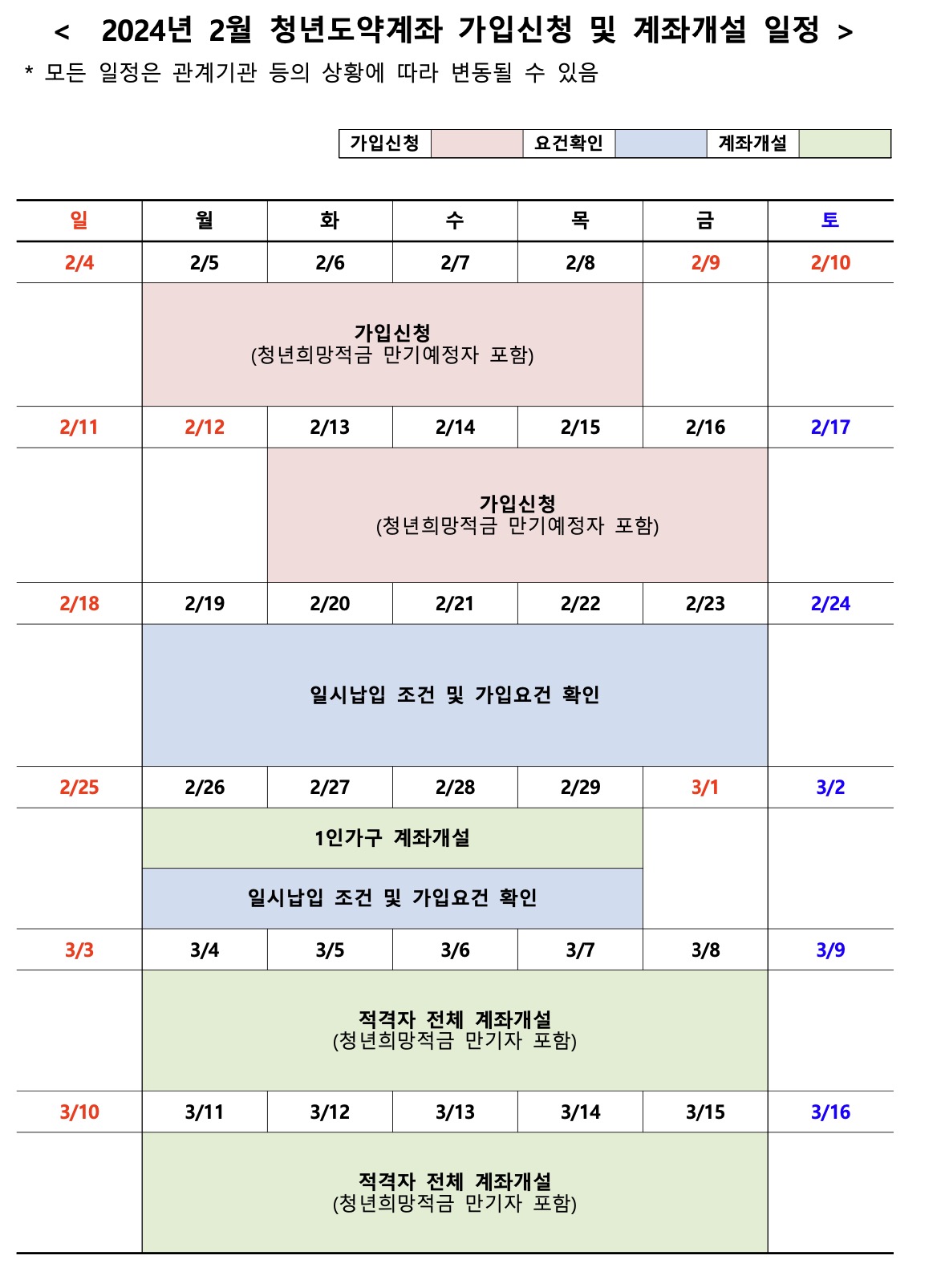 이후 2월 3째주에 일시납입 조건 및 가입요건 확인 기간이 있고 2월 말부터 계쫘개설이 들어갈 예정으로 보입니다. 따라서 일정에 맞춰 잘 준비하시고, 청년희망적금 만기때 맞춰서 청년도약계좌로 환승하시면 되겠습니다.
