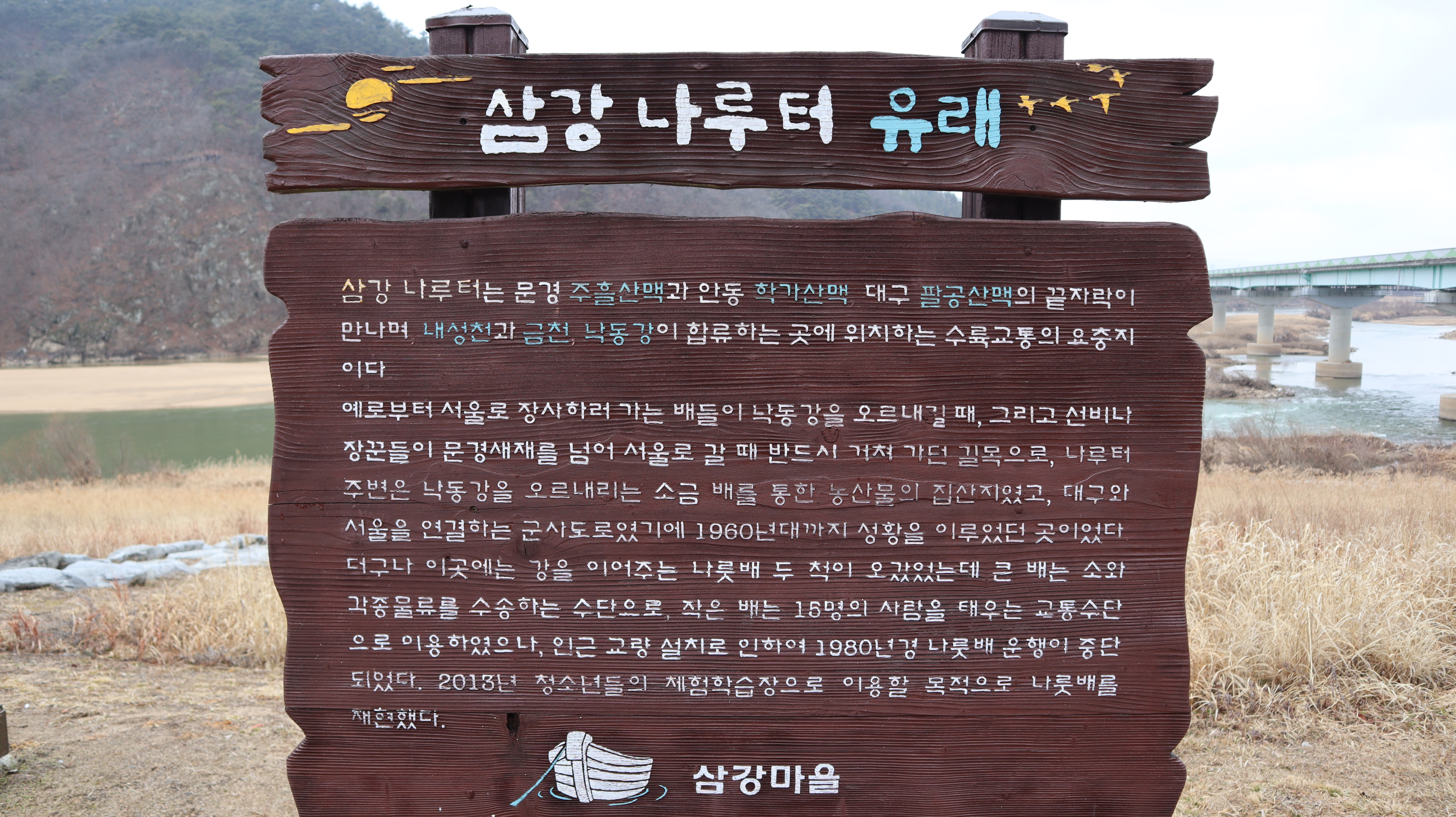 삼강주막을 거쳐 삼강나루터 쪽으로 이동해봅니다. 이곳도 포토존도 있고 사진 찍을 곳도 많은데요. 삼강나루터의 유래도 살펴보세요.