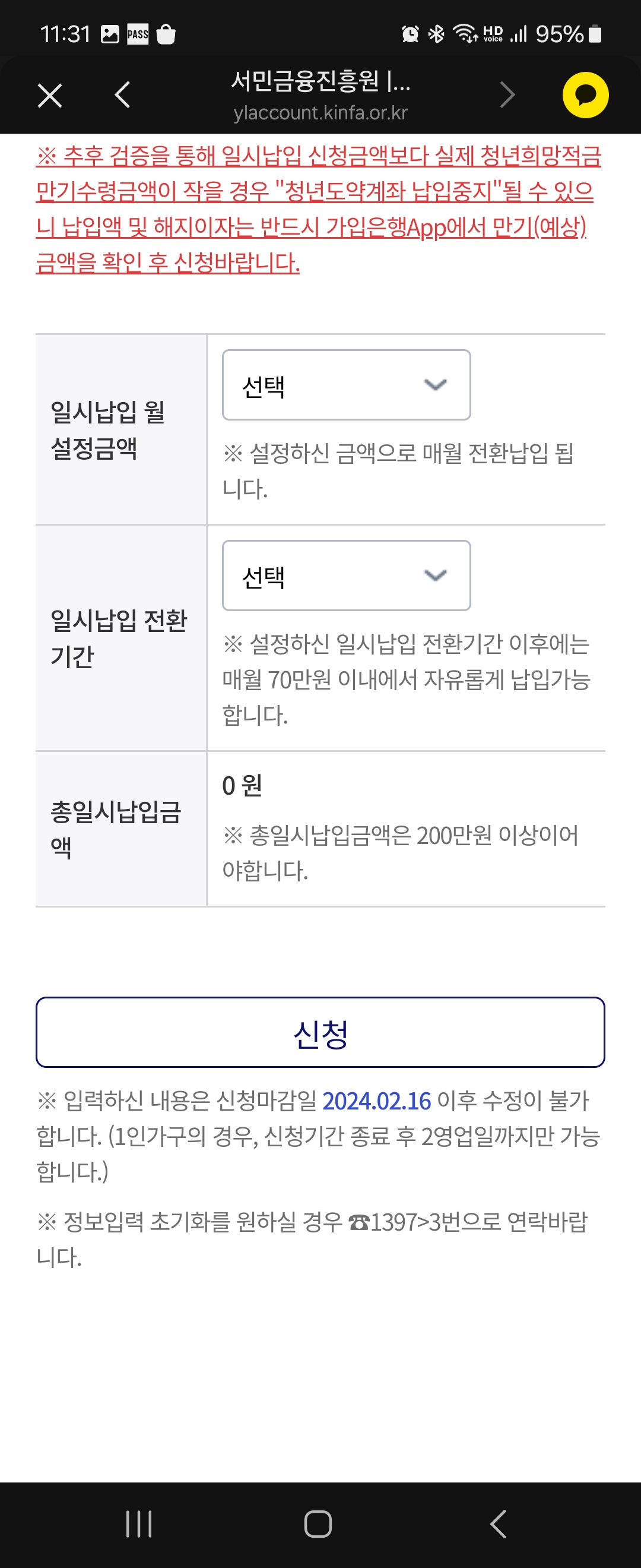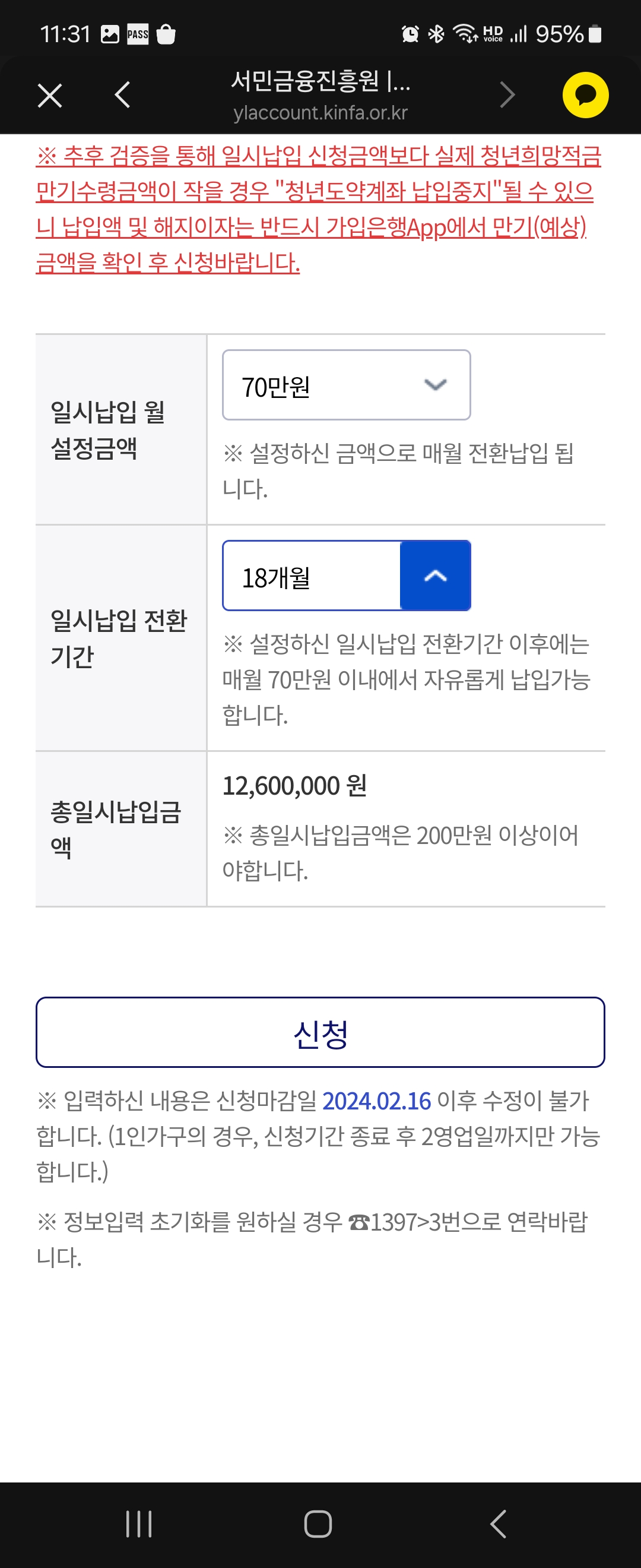 저는 1월말~2월초에 청년도약계좌 일시납입 연계가입 신청을 해둔 상태였고 어제 일시납입 정보 입력 알림톡이 와서 가입신청을 완료하게 되었습니다.