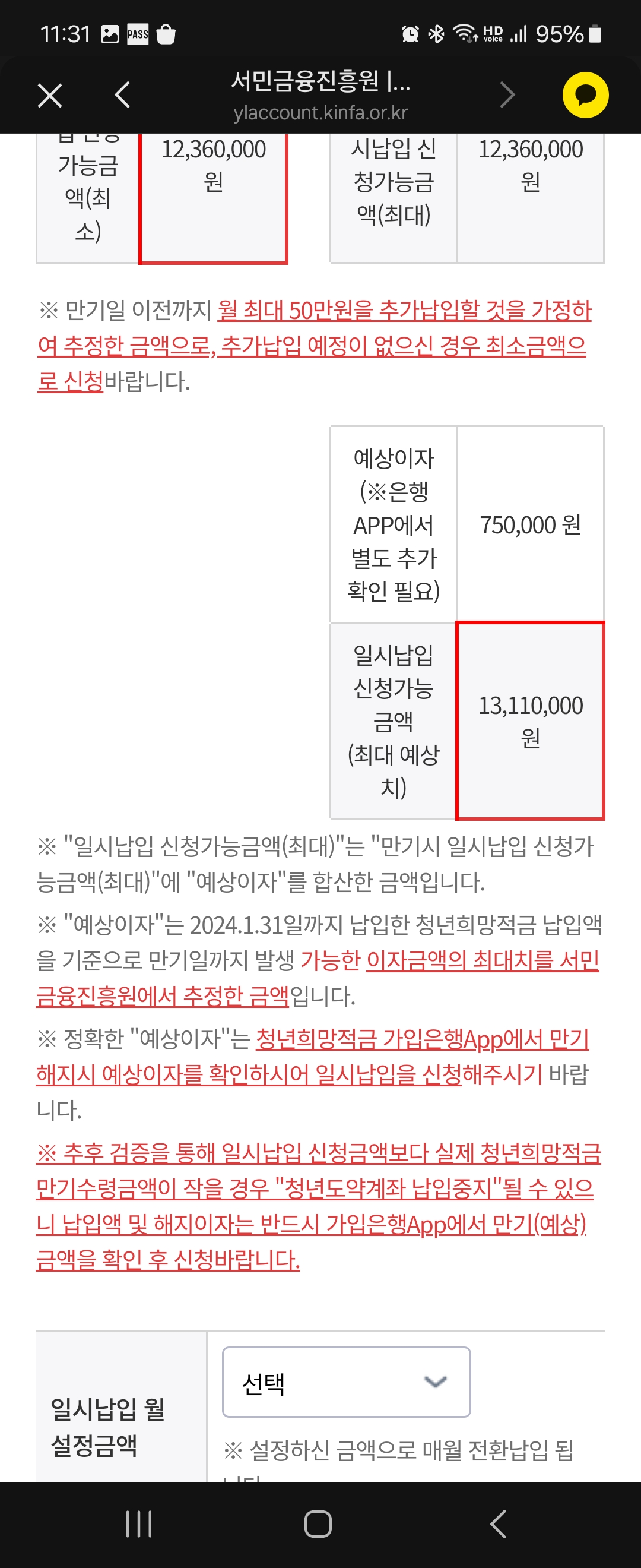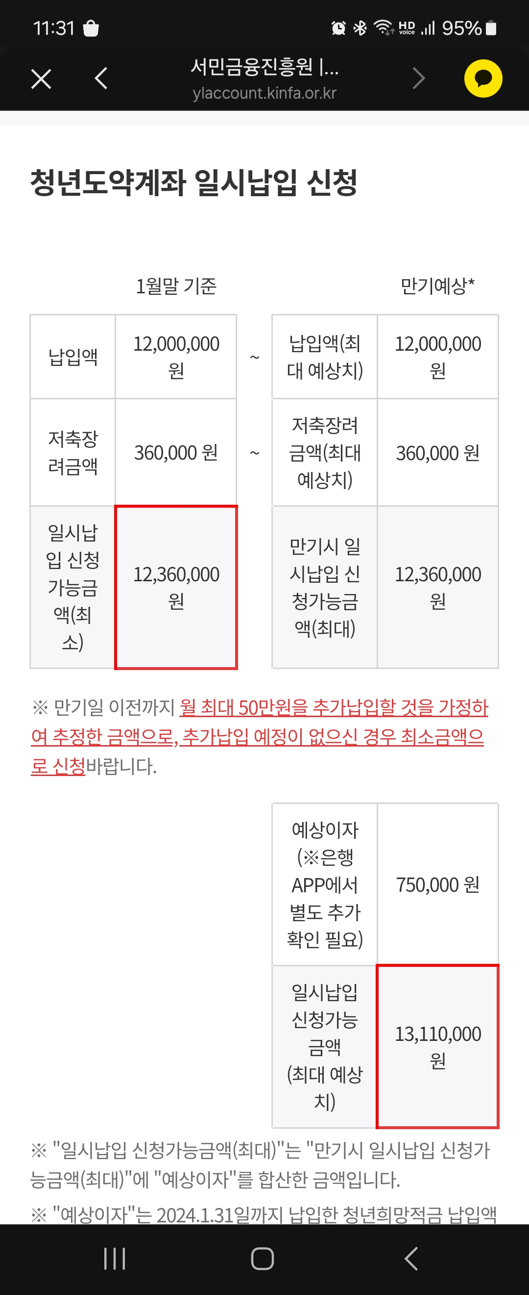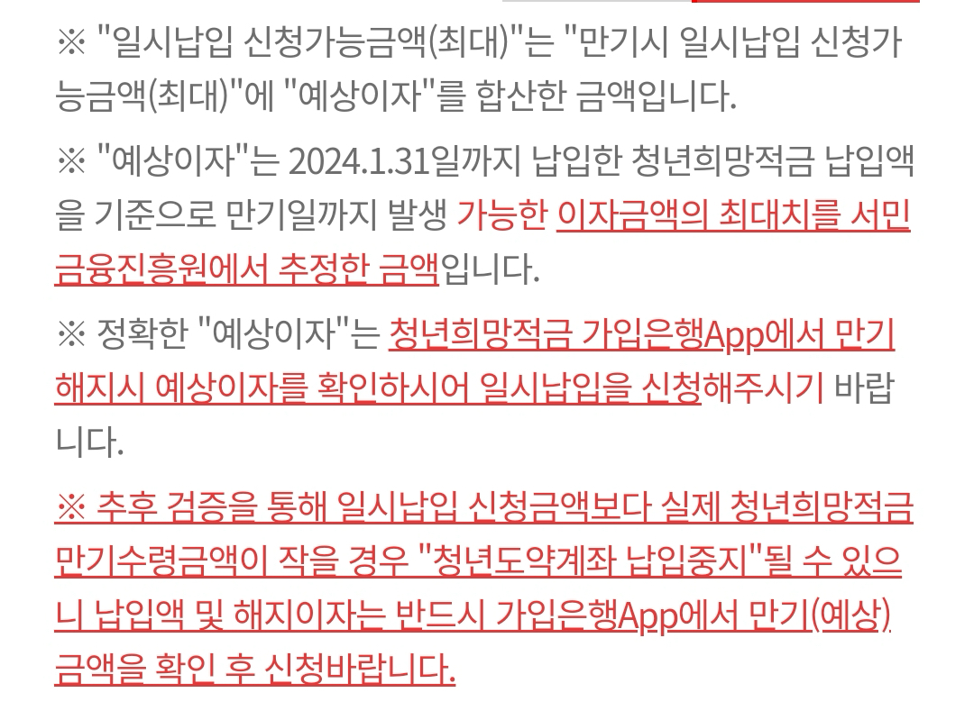 이때 주의할점이... 내가 청년희망적금 만기로 받는 금액보다 일시납입을 신청하는 금액이 크면 안된다는 부분입니다. 만약 올바른 방법으로 청년희망적금을 꾸준하게 납입해서 만기를 받았다면, 최대치로 대략 1,310만원 정도의 만기해지 예상 금액을 받을 수 있습니다.