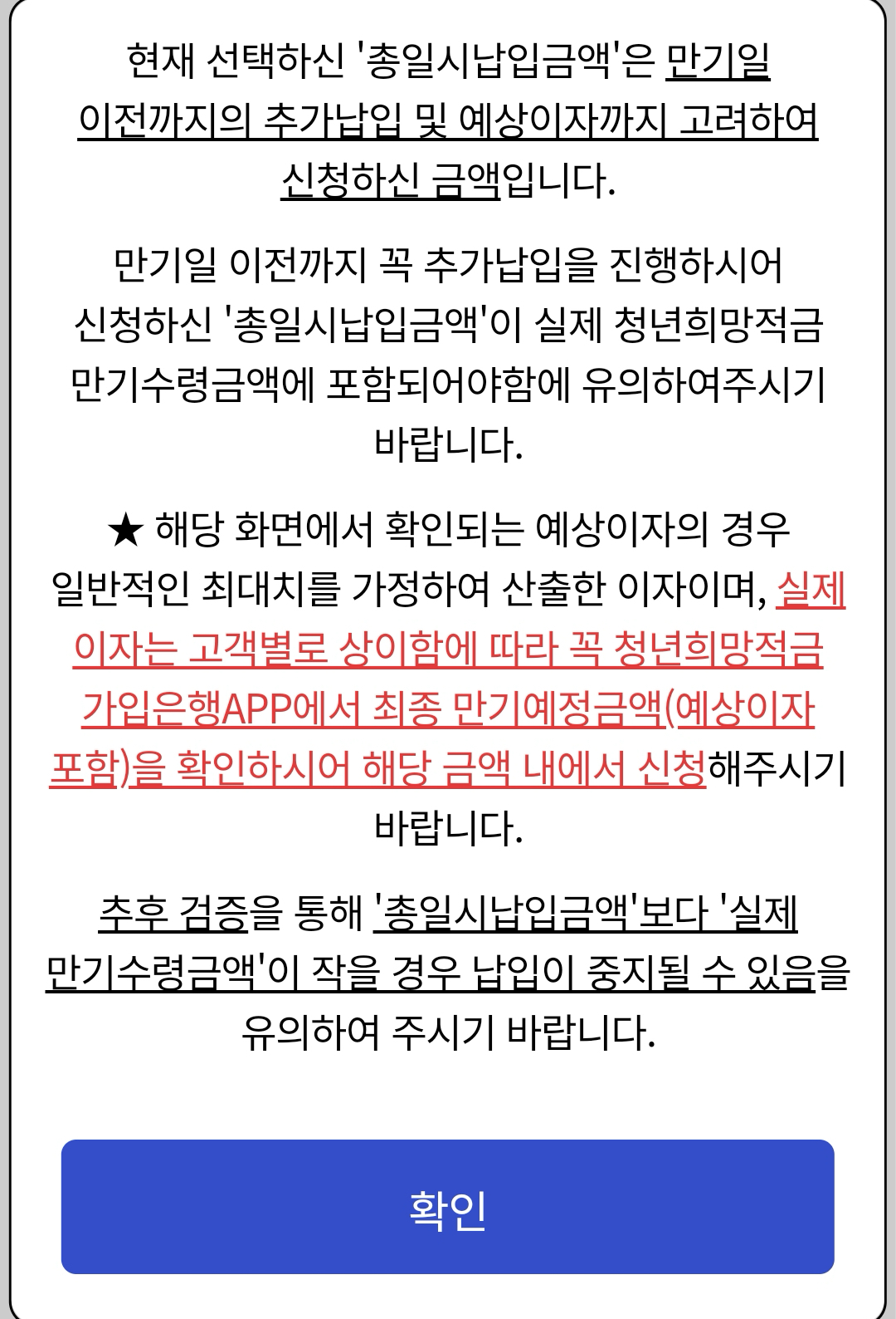하지만 월 설정금액을 70만원으로 설정할 경우 일시납입이 가능한 수치는 최대치가 1,260만원이기 때문에 1260만원을 일시납입하면 되는 방식입니다. 따라서 청년희망적금의 만기예상금액이 이자와 저축장려금을 포함해서 1260만원이 넘어야하며, 이 부분은 청년희망적금을 가입한 은행 앱에서 만기해지예상조회를 통해 확인이 가능합니다.