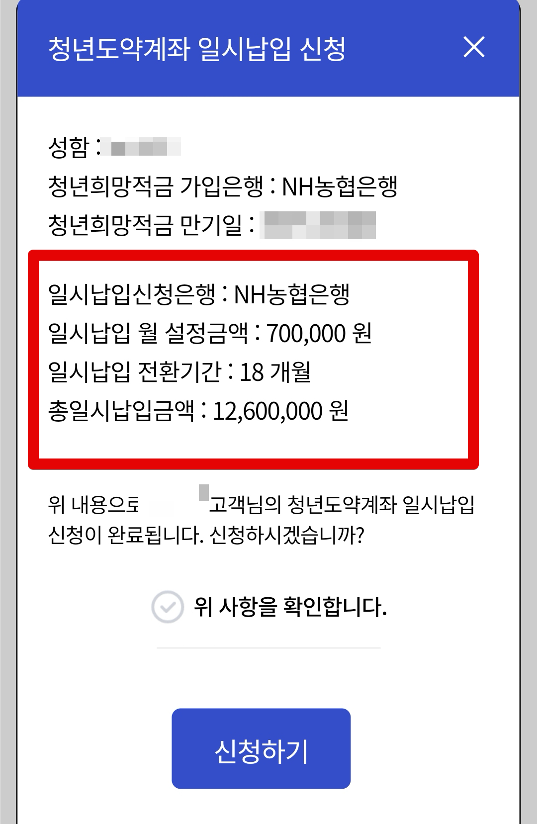 청년희망적금 청년도약계좌 연계 일시납입 신청완료(후기)