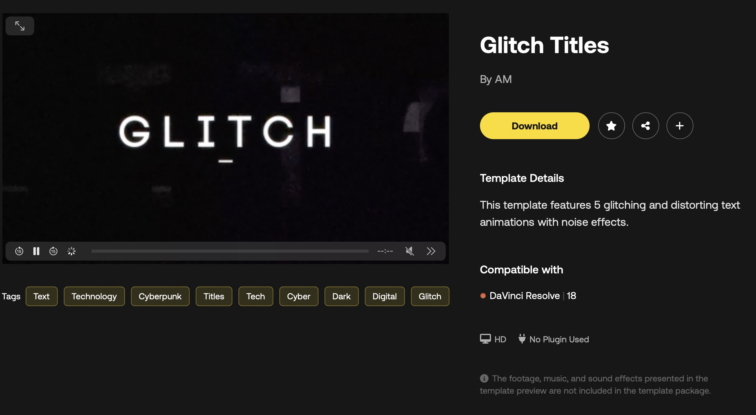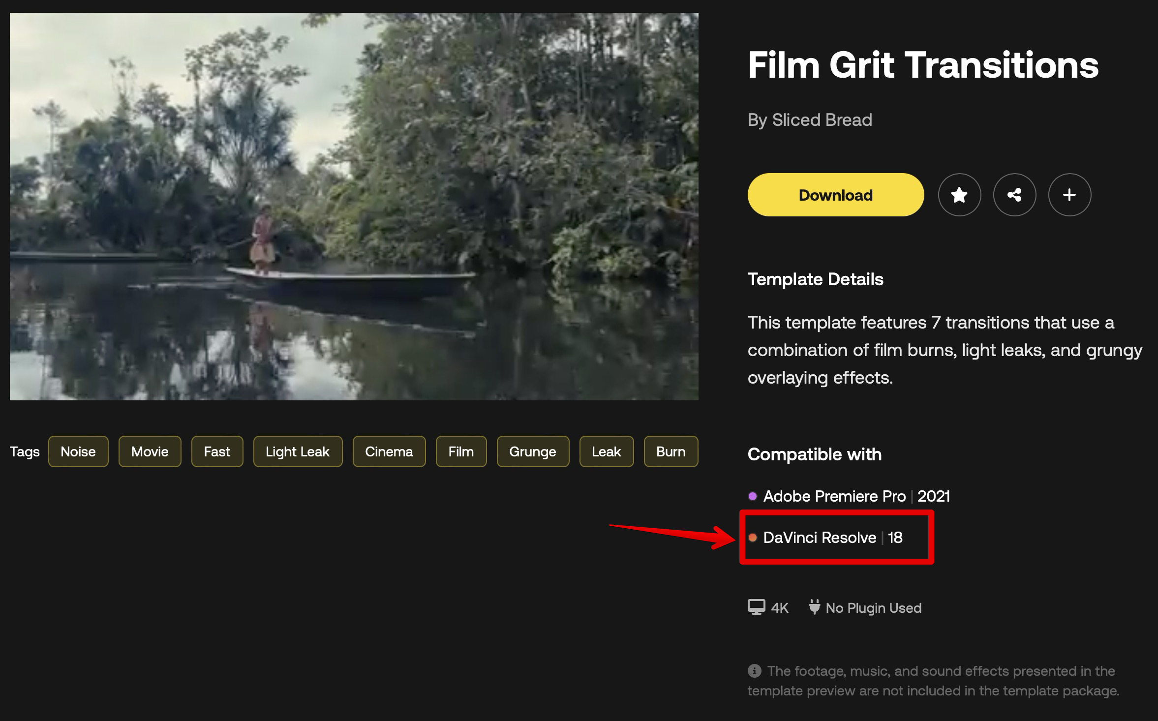 각 템플릿에서도 다빈치리졸브용 템플릿을 확인할 수 있는데요. 오른쪽 아래에 보시면 [DaVinci Resolve 18]이라고 해서 다빈치리졸브 18버전에서 쓸 수 있다는걸 알려주고 있습니다.