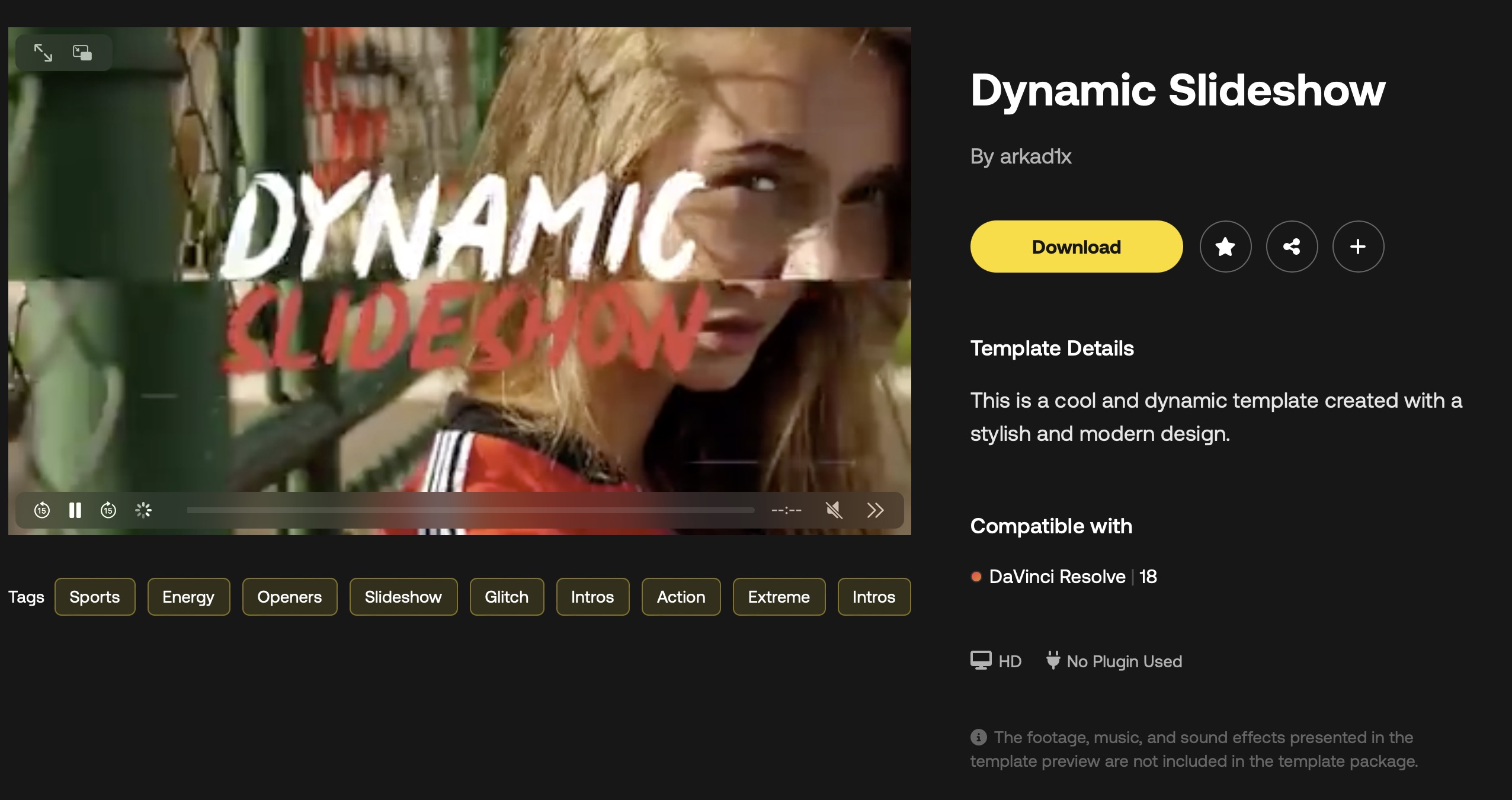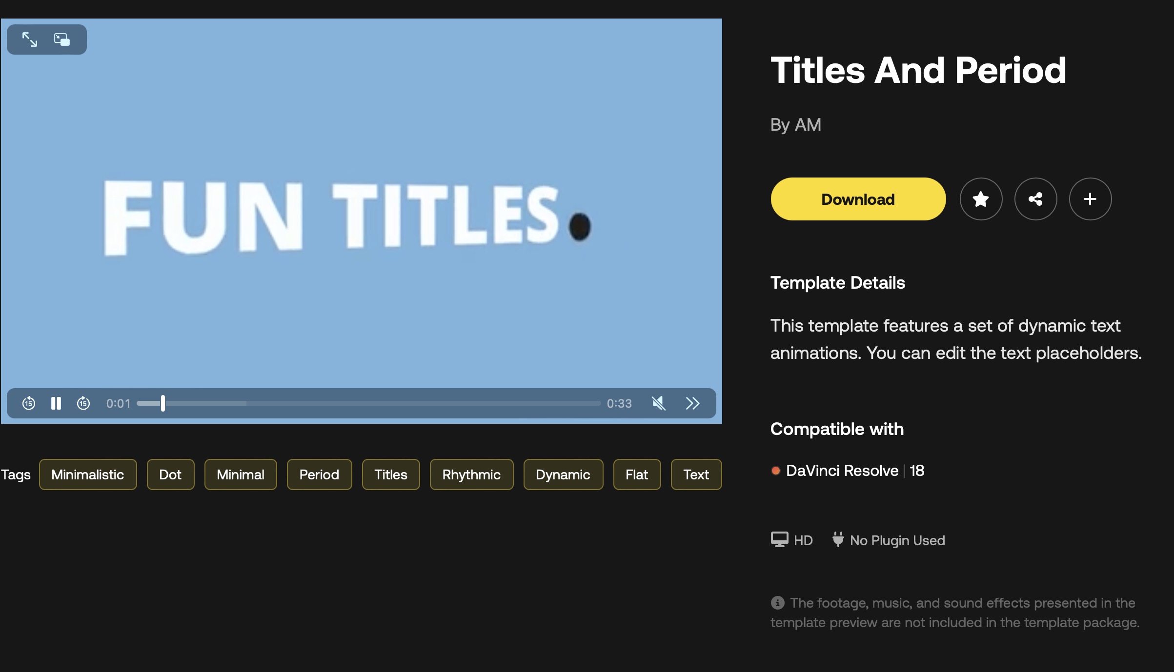 각 템플릿에서도 다빈치리졸브용 템플릿을 확인할 수 있는데요. 오른쪽 아래에 보시면 [DaVinci Resolve 18]이라고 해서 다빈치리졸브 18버전에서 쓸 수 있다는걸 알려주고 있습니다.