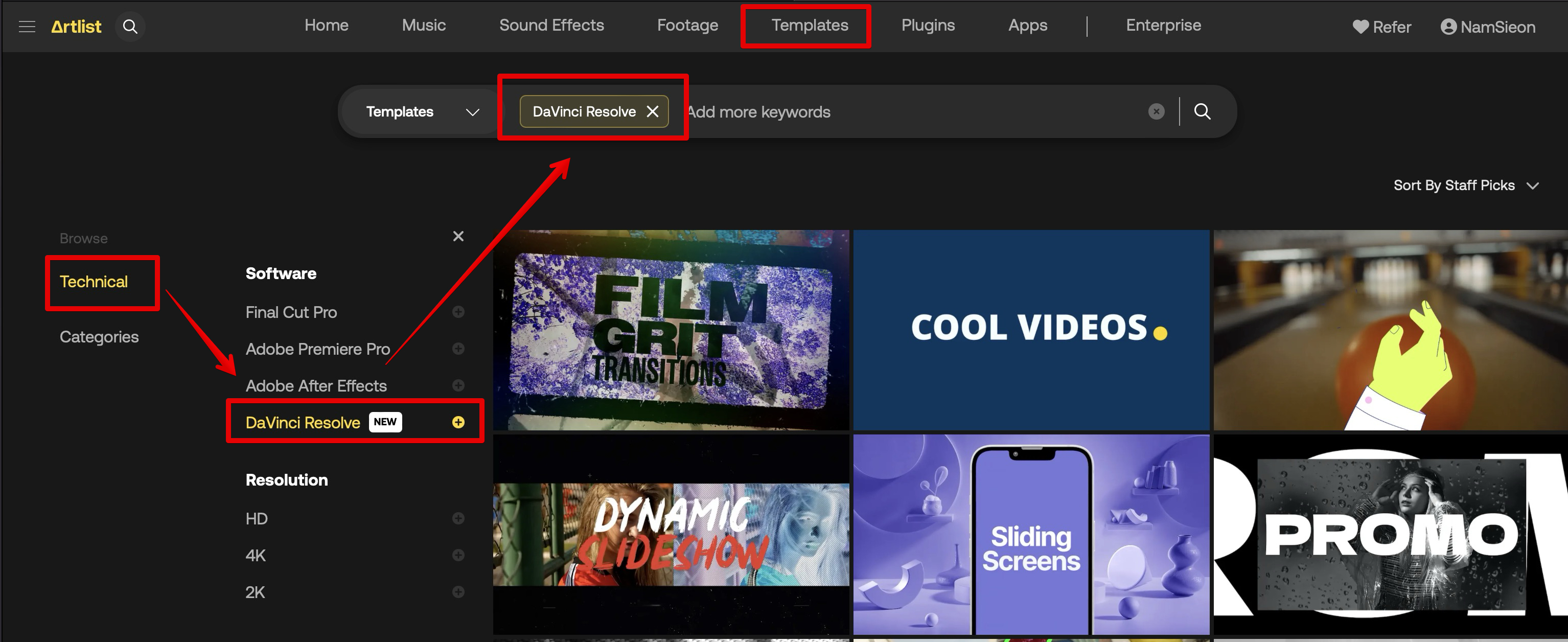 먼저 아트리스트 홈페이지로 접속합니다. 상단 메뉴에서 [Templates]으로 들어간 다음 왼쪽 메뉴에서 [Technical]로 들어가고 [DaVinci Resolve]를 선택합니다. 그러면 상단에 다빈치리졸브가 등록이 되며 다빈치리졸브 전용 템플릿들만 따로 모아볼 수 있습니다.
