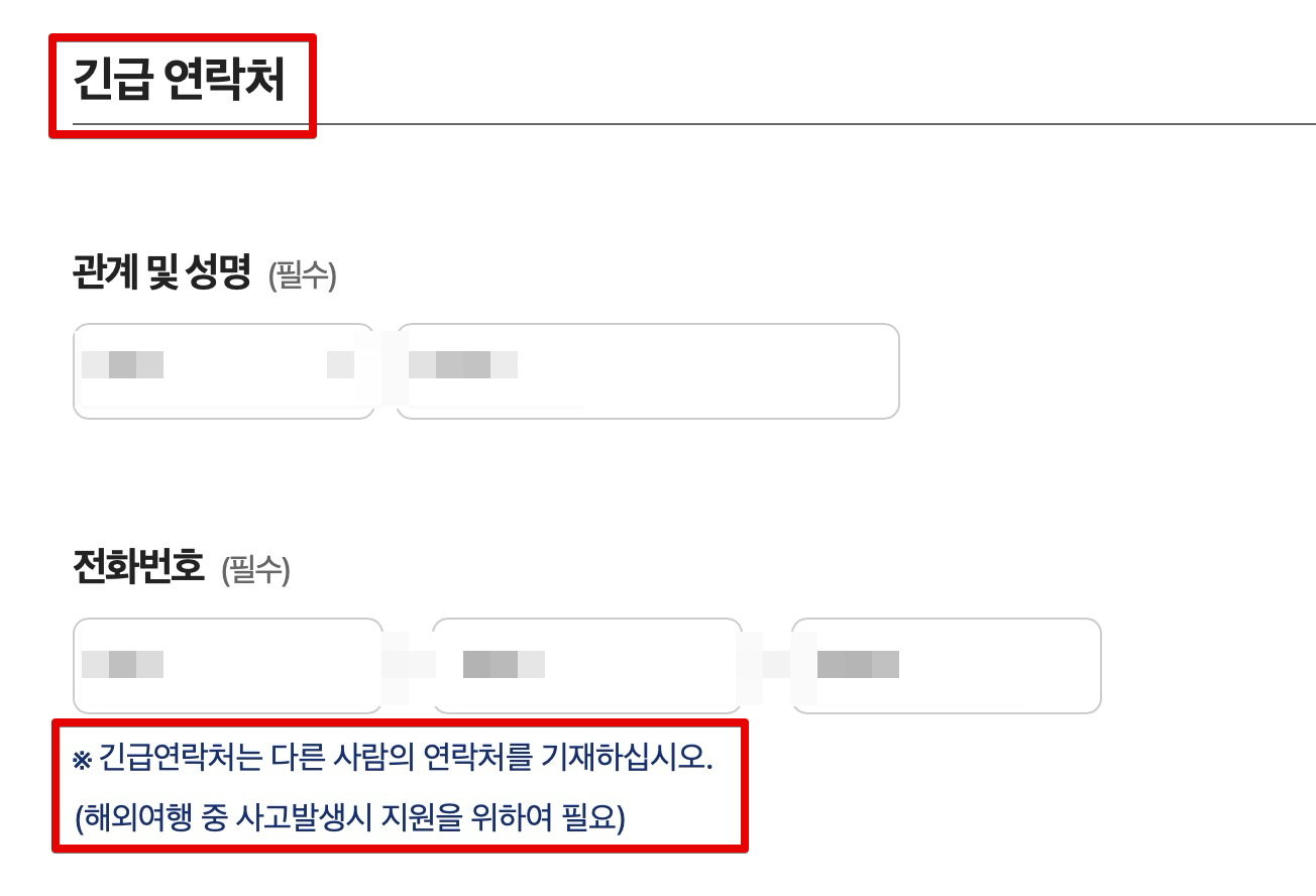 긴급연락처 적어주시고요. 부모님이나 다른 가족 등록하면 됩니다.