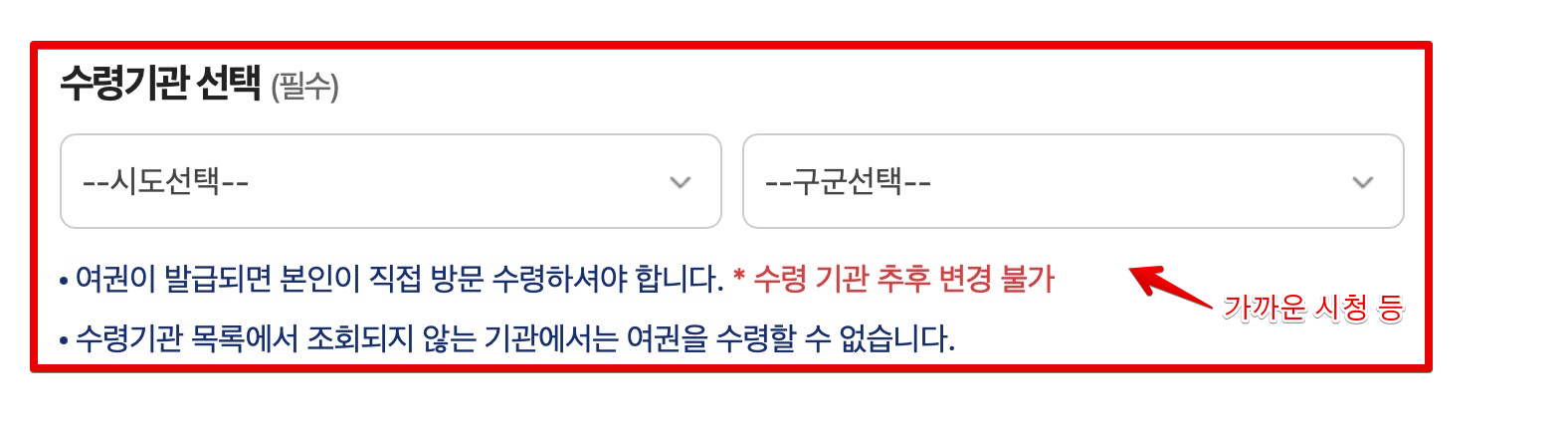 이제 여권 수령기관을 선택해야하는데 여기에서 가장 편하게 갈 수 있는 시청 등 기관으로 잡아주면 됩니다. 이 부분이 앞에서 얘기한 수령기관 변경 불가하다는 곳이므로 꼭 신중하게 선택하셔야 합니다.
