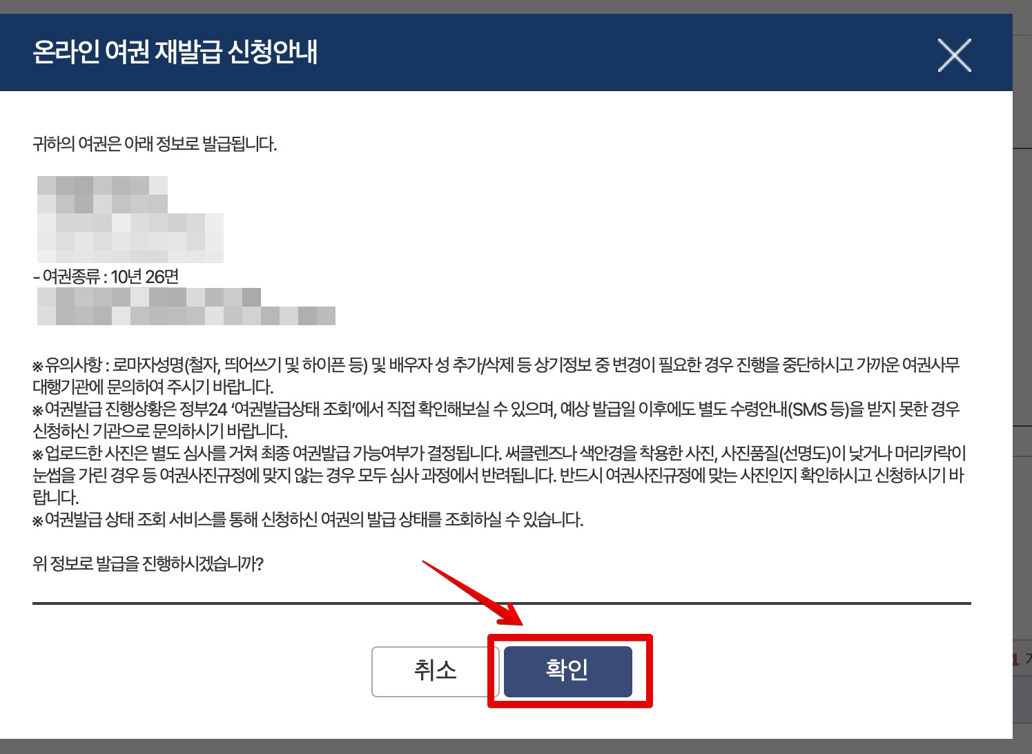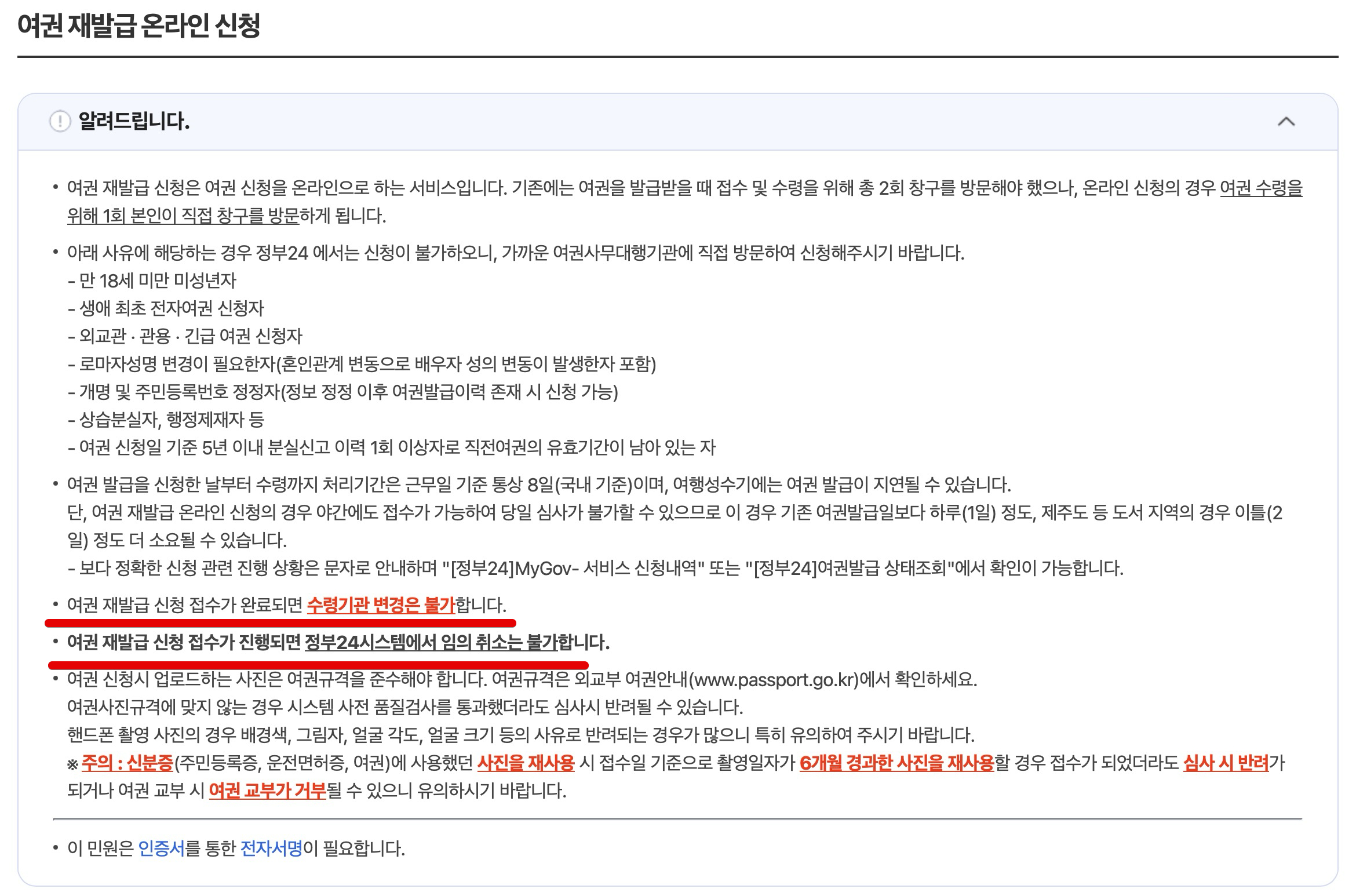 이제 여권 재발급 온라인 신청할 때 읽어볼만한 부분들인데요. 나머지는 위 설명과 동일하고 여권 재발급 신청 접수가 진행되면 취소가 불가능하다고 합니다.