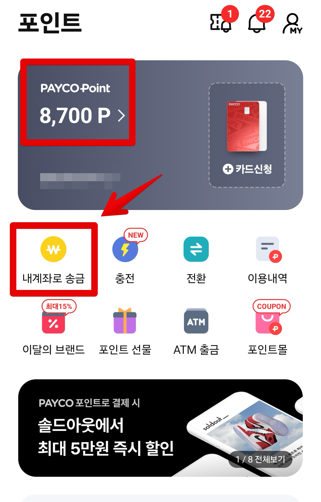 이제 마지막으로 페이코에서 결제하고 남은 포인트를 계좌로 송금해야합니다.