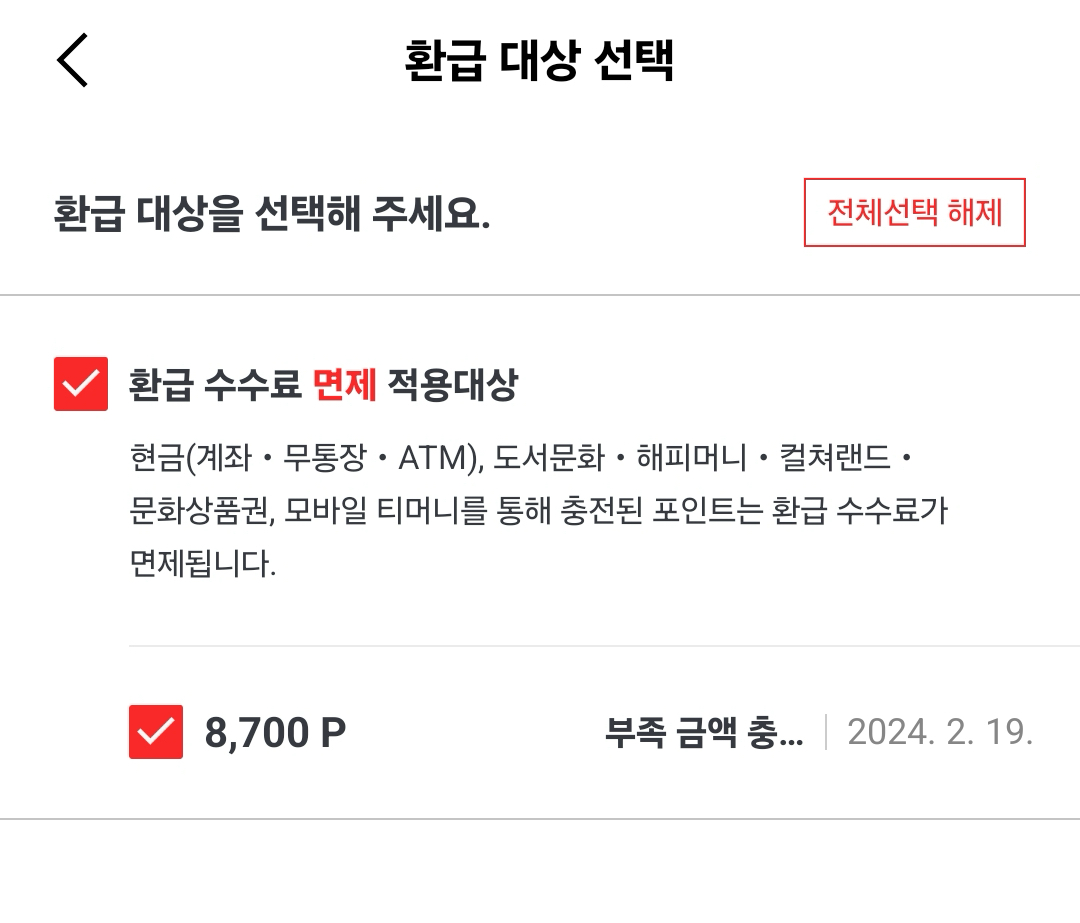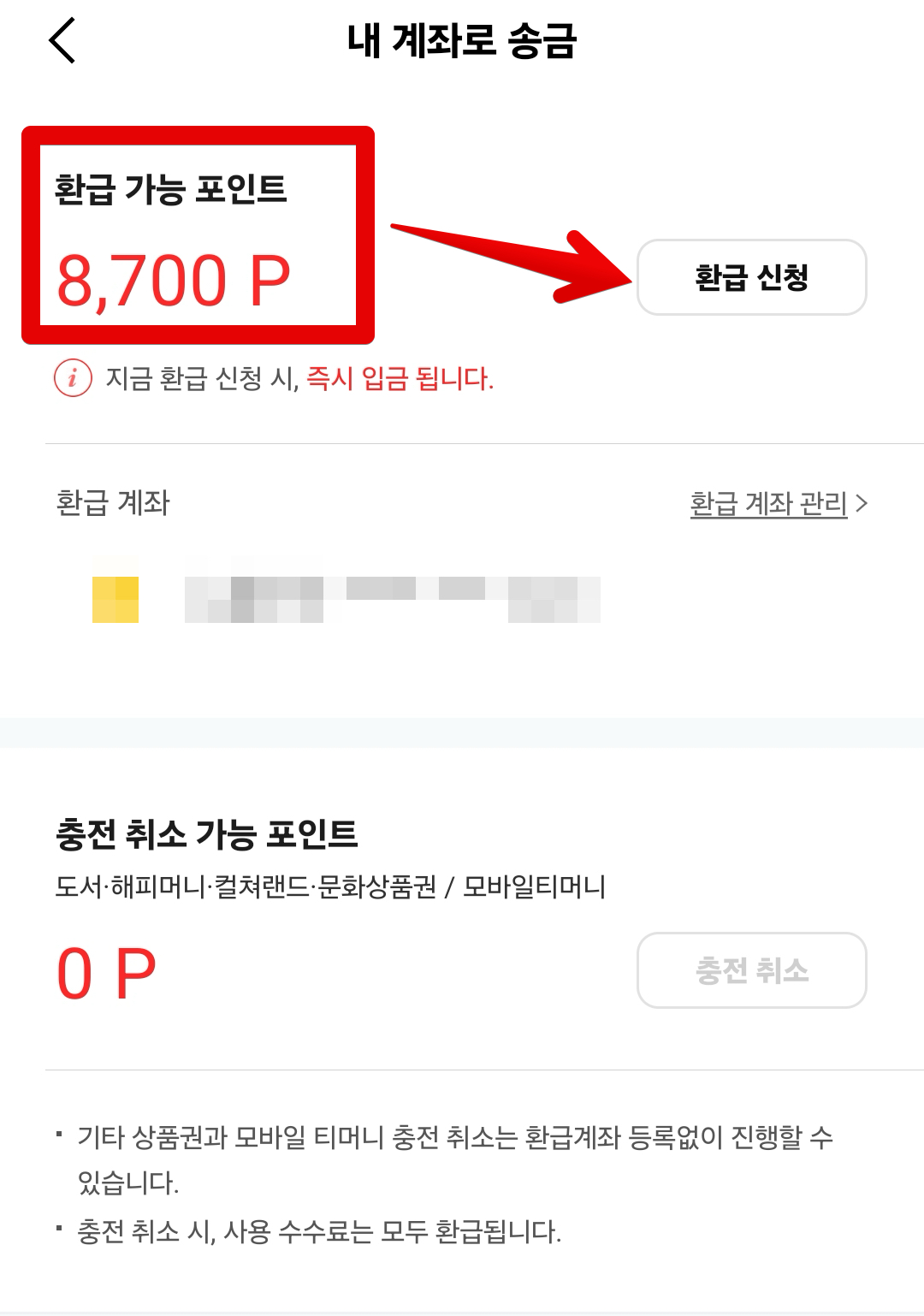 현금으로 충전한 포인트, 문화상품권 충전 포인트의 경우 환급 수수료 면제 대상이기 때문에 아무런 손해없이 출금할 수 있습니다. 문화상품권의 경우 충전을 할 때 페이코에서 수수료가 있어서 뺄 때는 수수료 없습니다. 이렇게 환급까지 마쳐주면 끝!