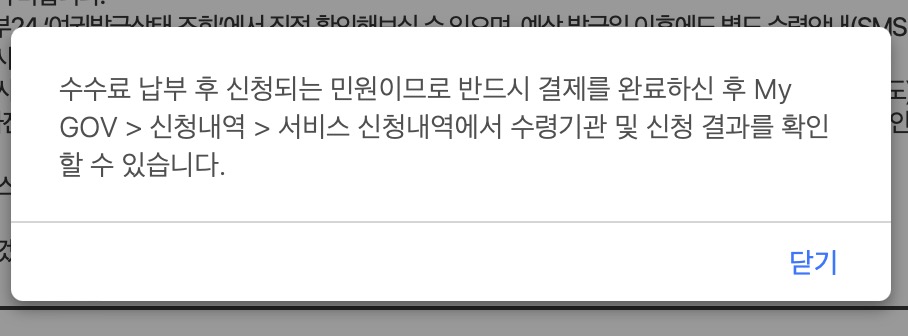 결제가 완료되면 [정부24 서비스 신청내역]에서 확인할 수 있습니다. 신청하자마자 확인해보면 [처리중]으로 나옵니다.