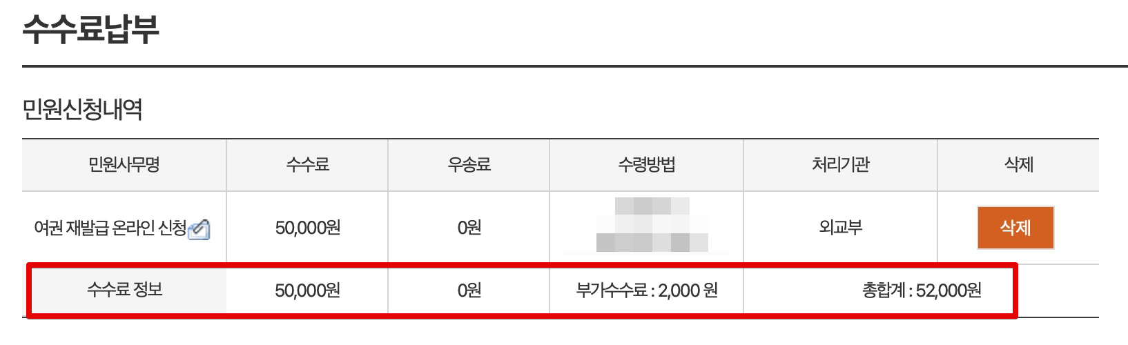 여권 재발급 온라인 신청 수수료 항복을 보면 수수료가 5만원이 잡혀있고 부가수수료가 2천원이 잡혀있는걸 볼 수 있습니다.