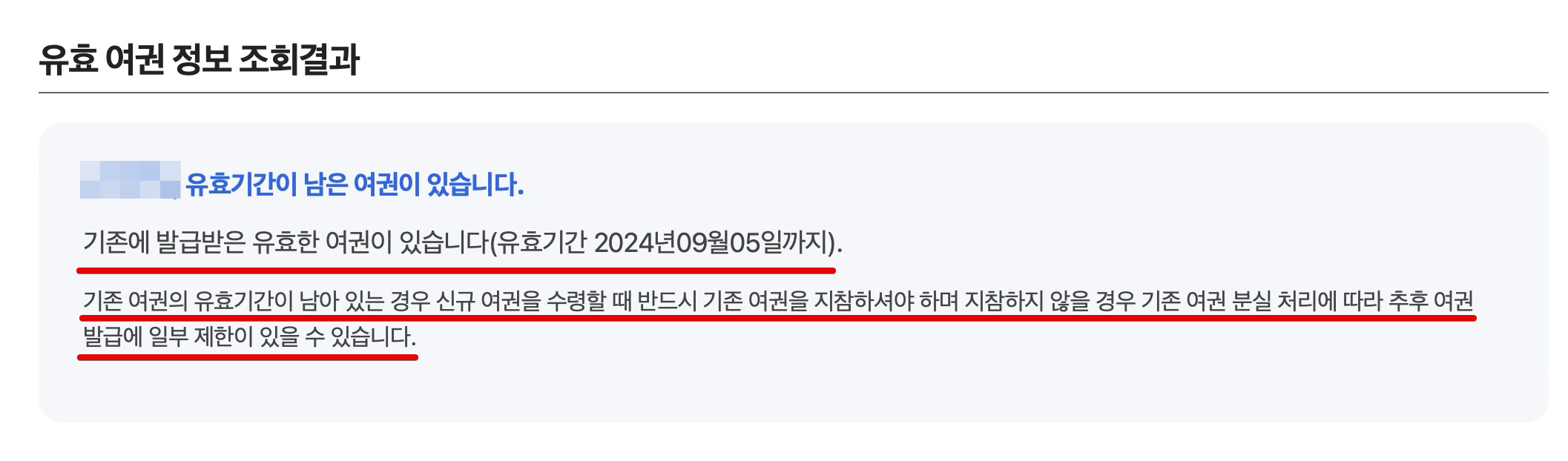 자신의 유효여권을 조회해보면 유효기간을 조회할 수 있는데요. 저같은 경우 어느덧 10년이 되어버려서 2024년 9월까지가 유효기간이었네요. 기존 여권 유효기간이 남아있을 경우 여권 수령시 반드시 기존 여권을 챙겨가야합니다.