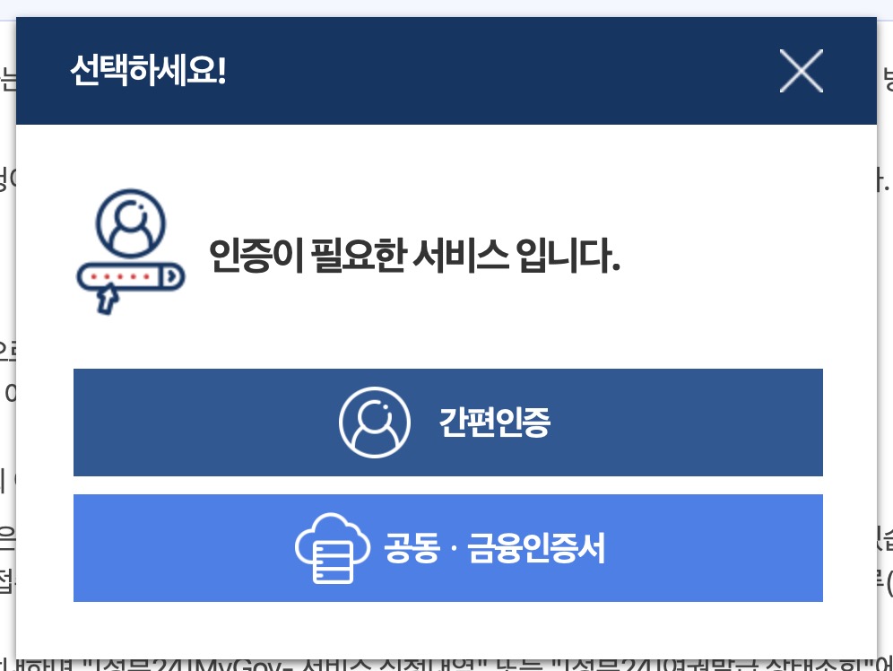 여기에서 한 번더 인증이 필요합니다. 공동인증서나 금융인증서 필요없이 간편인증으로 인증 가능합니다.