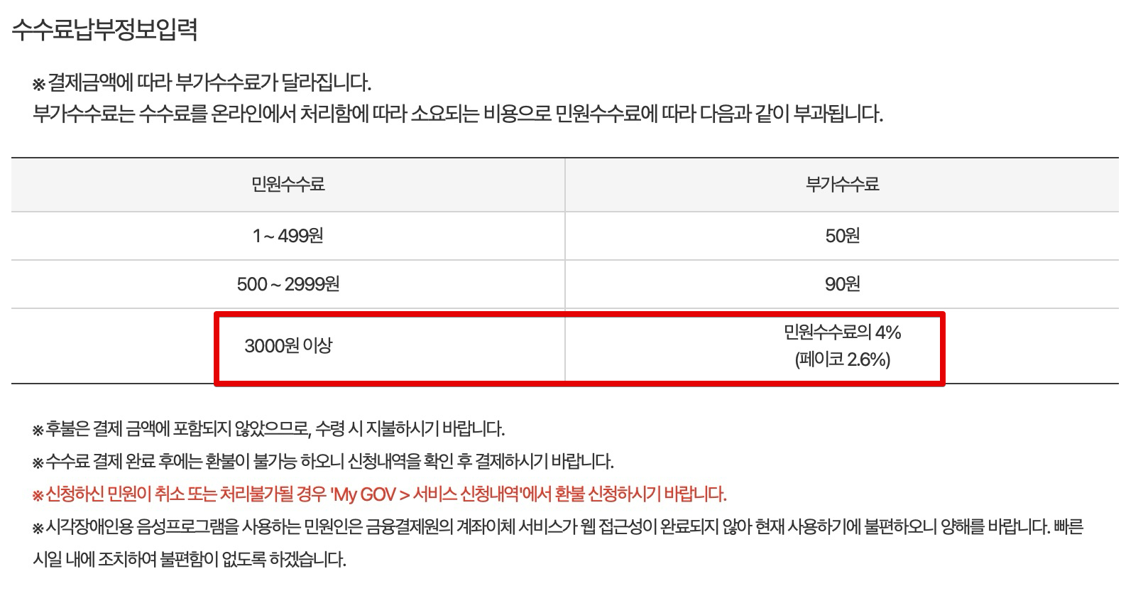 수수료의 경우 결제금액에 따라 정해지는데, 3천원 이상일 경우 4%의 민원수수료가 들어갑니다. 즉, 기본 여권 재발급 비용 수수료 5만원에 4%면 2천원이거든요. 그런데 여기 밑에 부가수수료 항목 아래에 보시면 페이코의 경우 수수료가 2.6%로 더 저렴하다는걸 알 수 있었어요.