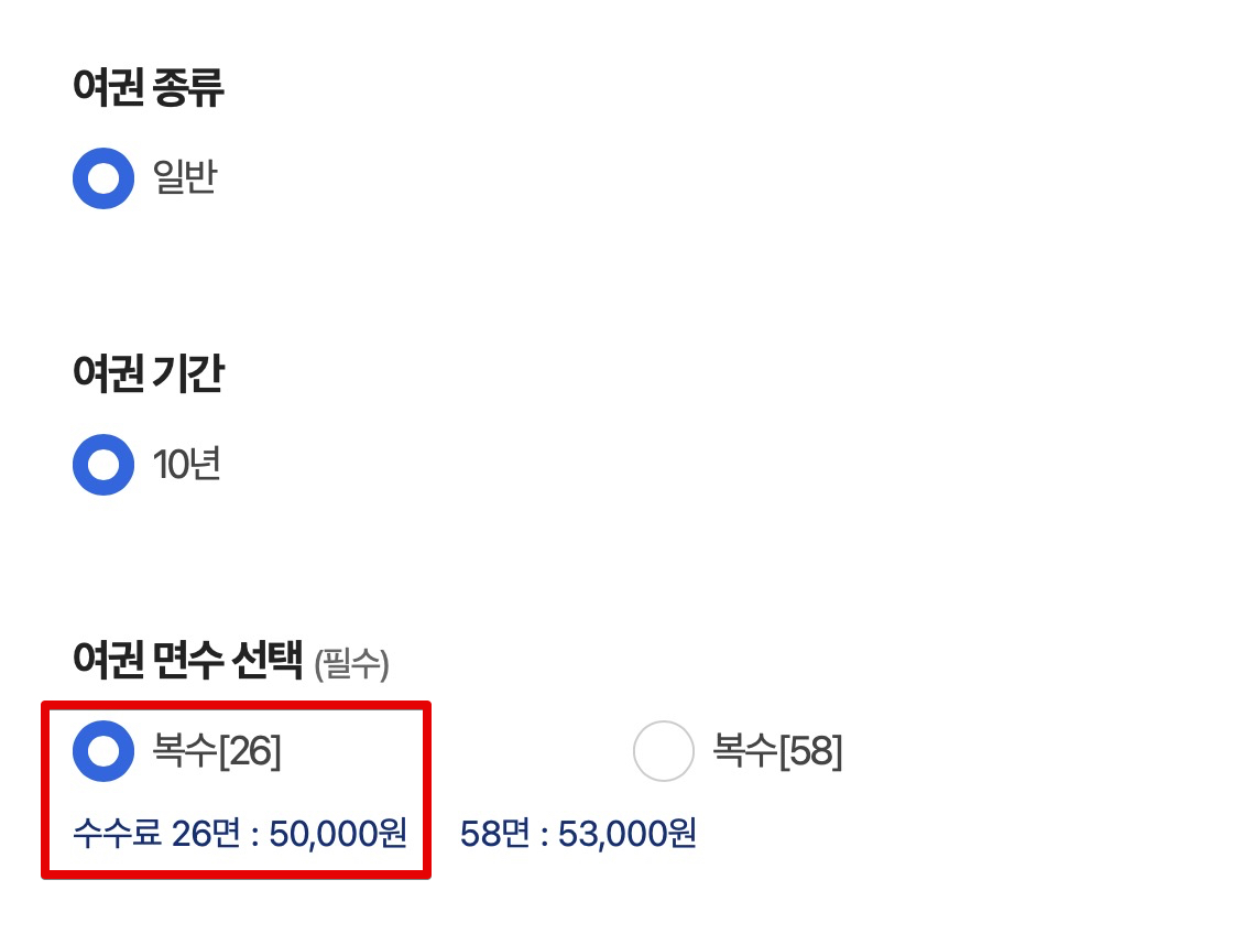 여권 종류는 일반, 여권기간은 10년으로 고정돼 있네요. 예전에는 여권기간도 다양했었던 것 같은데 요즘에는 다 10년인 것 같아요. 그리고 여권 면수를 선택해야하는데 저는 복수 26매로 선택했습니다. 여권 몇번 쓰면서 살아보니까 26매 다 쓰는 것도 쉽지 않더라고요. 해외여행 엄청 자주가시는분들은 58매로 하시면 될 것 같지만, 전 26매로도 충분할 것 같아서 26매로 했습니다.