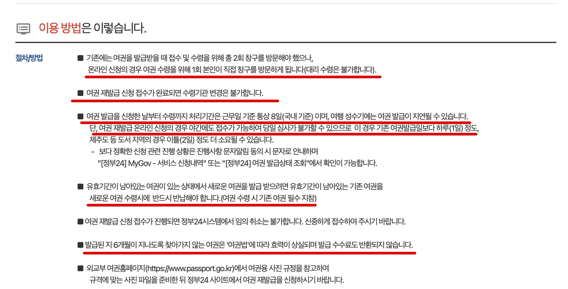 이용 방법은 간단합니다. 온라인으로 여권 재발급 신청의 경우 여권을 수령할 때 딱 한 번만 수령기관에 방문하면 된다고 하고요. 신청한 날로부터 처리기간은 근무일 기준으로 통상 8일 정도가 걸린다고해요. 근무일 기준이기 때문에 대략 2주일 정도 걸린다고 생각하면 될 것 같으므로 만약 해외여행이 2주 넘게 남아있더라도 미리 신청해서 재발급 받아놓는게 좋을 것 같습니다.