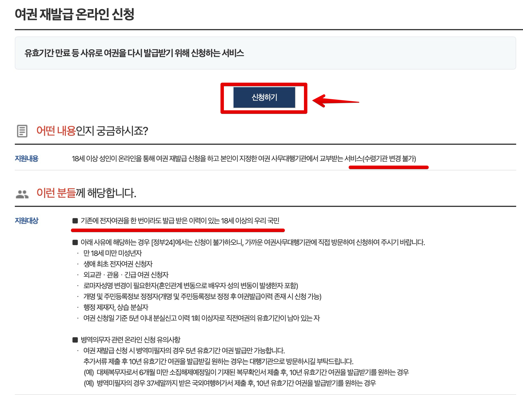 여권 재발급 온라인 신청 화면이 나타납니다. [신청하기] 버튼을 제일 위에 있고요. 아래쪽에 읽어볼만한 부분들만 밑줄을 쳐두었는데요. 일단 처음에 수령기관을 정하면 변경이 불가능해서 신중하게 정해야하겠습니다.