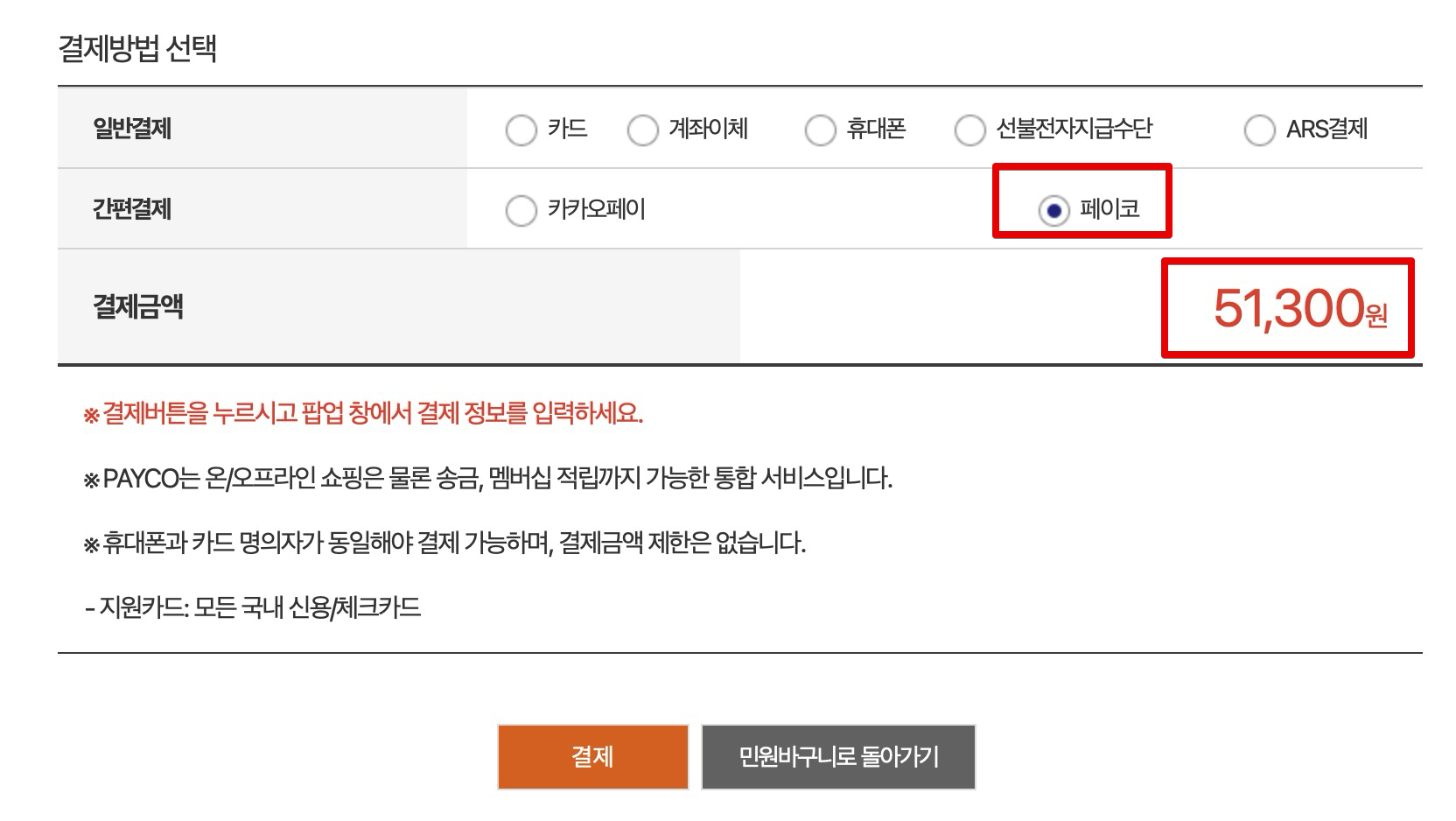 그래서 결제할 때 페이코로 선택해보니까 실제로 52,000원이 51,300원으로 저렴해졌습니다. 그래서 페이코로 결제 진행하였습니다. 페이코 결제의 경우 제가 지난번에 문화상품권 등록해서 앱스토어 앱 구매할 때 썼었는데, 그때 등록해둔게 이렇게 또 쓸 일이 있을줄은 몰랐네요 ㅎㅎ