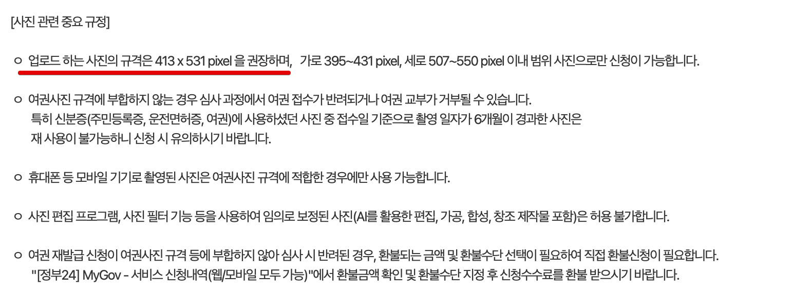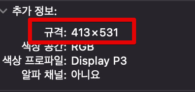 여권 사진 규격의 경우, 413픽셀 * 531 픽셀이 권장된다고 합니다.