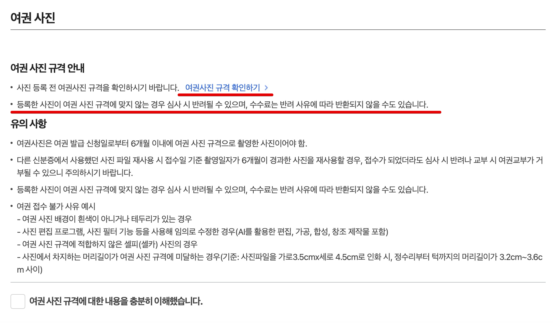 이제 여권 사진을 등록해야합니다. 여권사진 규격을 확인할 수 있도록 하고 있으니 참고해보세요.