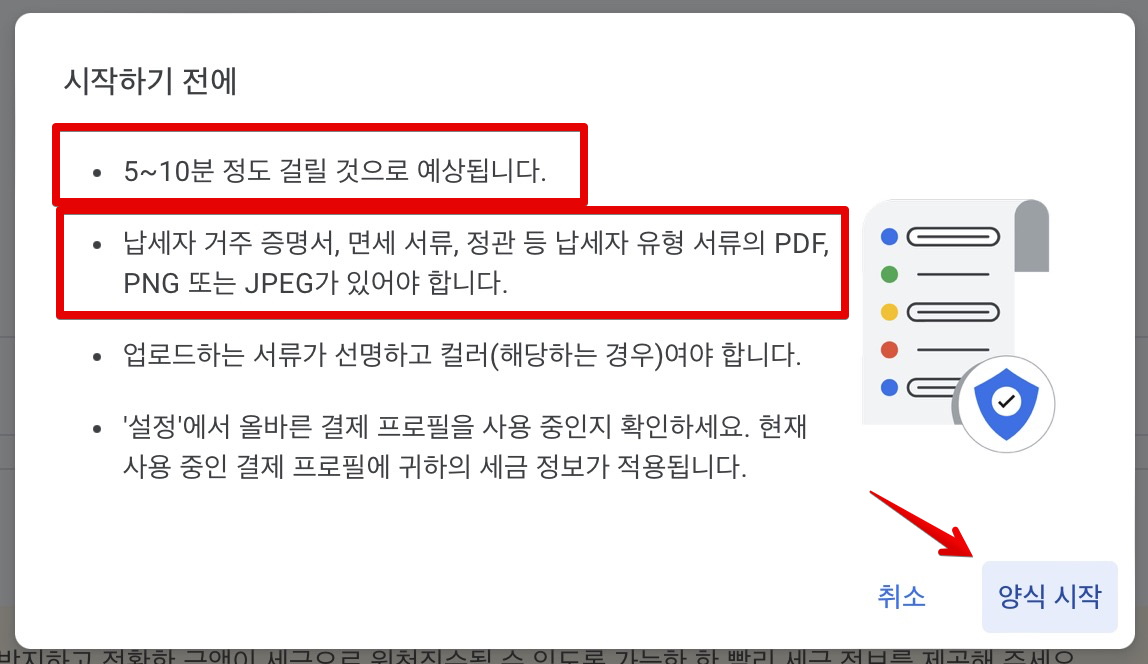 이제 구글 애드센스 페이지에서 세금 정보 등록을 클릭해보면 시작하기 전에 납세자 거주 증명서 등 증빙서류를 준비하라고 나옵니다. 먼저 준비를 해주고 다시 이어가야합니다.
