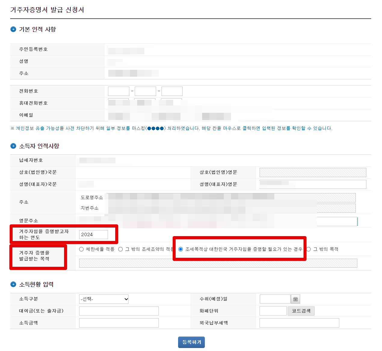 이제 거주자증명서 발급 신청서 내용을 작성해야하는데요. 다른 것들은 보이는대로 적어주시면 되는데 여기에서 핵심적인 부분이 [거주자임을 증명받고자하는 연도]에 '2024'(2024년 일 경우)을 넣어줍니다. 그리고 [거주자 증명을 발급받는 목적]에는 '조세목적상 대한민국 거주자임을 증명할 필요가 있는 경우'를 체크합니다.