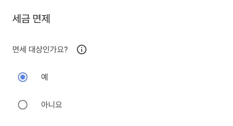 세금 면제 대상 여부에 대해서는 이 부분 관련으로 다른분들이 올리신걸 좀 찾아보니까, 어떤분들은 면세 대상에 "아니요"를 선택했고, 또 어떤분들은 면세 대상에 "예"를 선택하셨더라고요. 이 부분은 구체적으로 "예"로 해야하는지 "아니요"로 해야하는지 잘 몰라서 일단은 "예"로 하고 등록하였습니다.