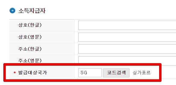 다음으로 소득지급자에 발급대상국가를 입력해야하는데요. 이 부분은 US로 입력해서 미국으로 신청한 후기들도 있었는데 저 같은 경우에는 뭔가 싱가포르 관련이기 때문에 싱가포르로 입력해야할 것이라고 생각해서 SG로 입력하였습니다.